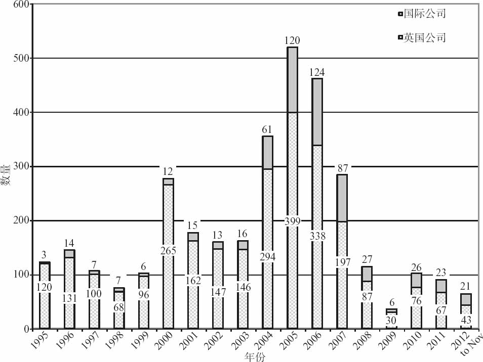 2000~2007年期间,AIM吸引了相当数量的公司,如图4-21所示,包括美国公司。