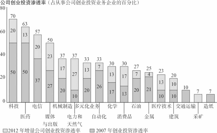注:渗透率用2007年和2012年每个从事公司创业投资业务的样本行业的公司比例来衡量。每个样本行业包括市值最大的30家跨国公司。