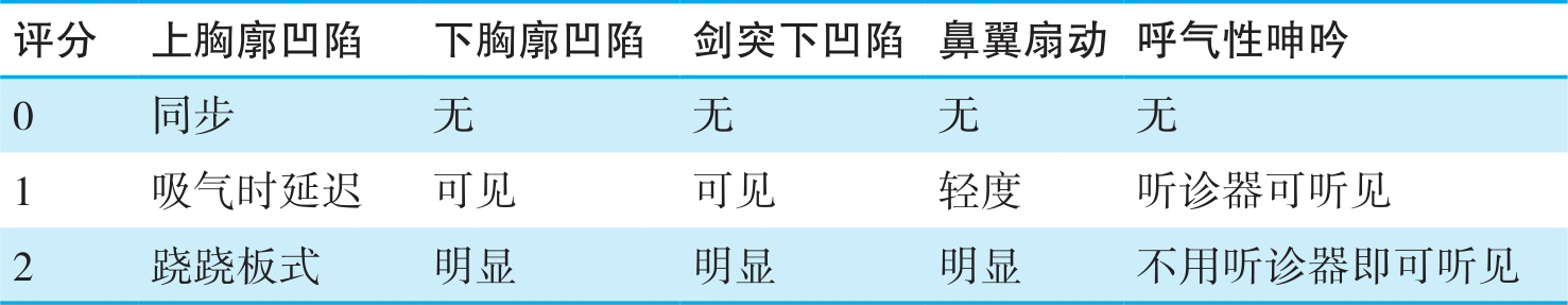 Silverman Anderson(SA)评分(表1-1)简便易行、实用,能客观反映呼吸窘迫的严重程度,有利于在床边快速评估病情,及时做出正确处理,提高NRDS的救治质量。
