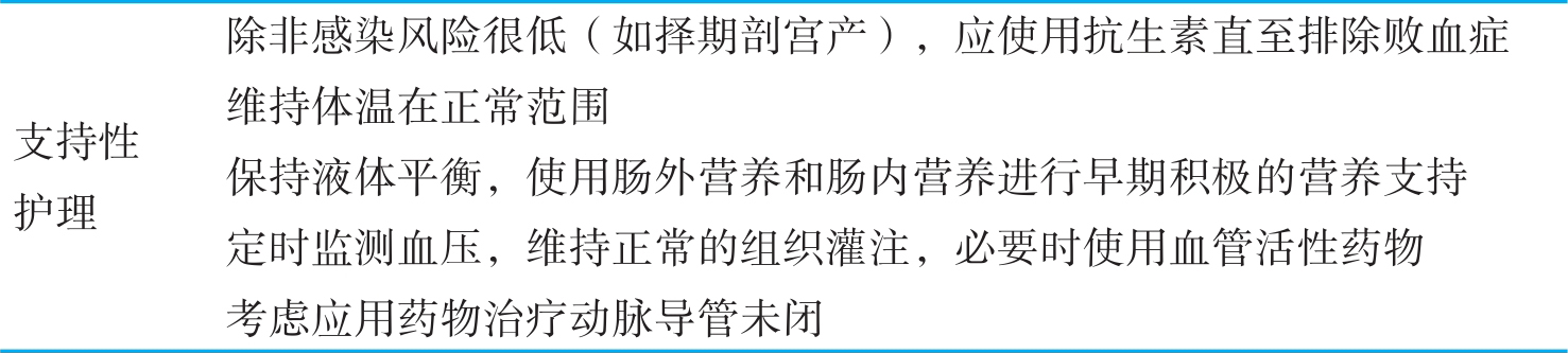注意保暖,保持适宜的温度,减少氧耗。维持营养和水、电解质平衡。保湿暖箱中的早产儿静脉补液起始剂量为70~80ml/(kg·d)。早产儿的水、电解质治疗应个体化,出生后最初5d应允许体重每日下降2.5%~4%(共计15%)。出生后前几天限制钠摄入,尿量增加后方可补钠。严密监测液体平衡和电解质情况。