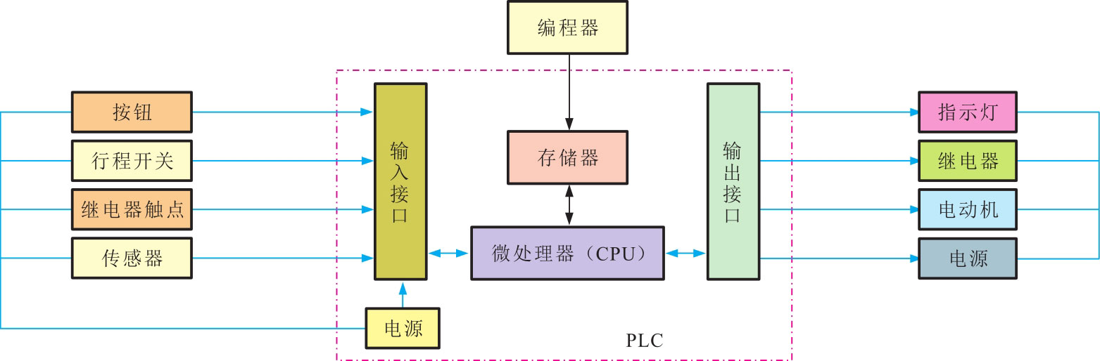为了应对继电器控制系统的不足,既能让工业控制系统的成本降低,同时又能很好地应对工业生产中对控制要求的变化,工程人员将计算机技术、自动化技术及微电子和通信技术相结合,研发出了更加先进的自动化控制系统,即PLC。图1-15为PLC的功能简图。