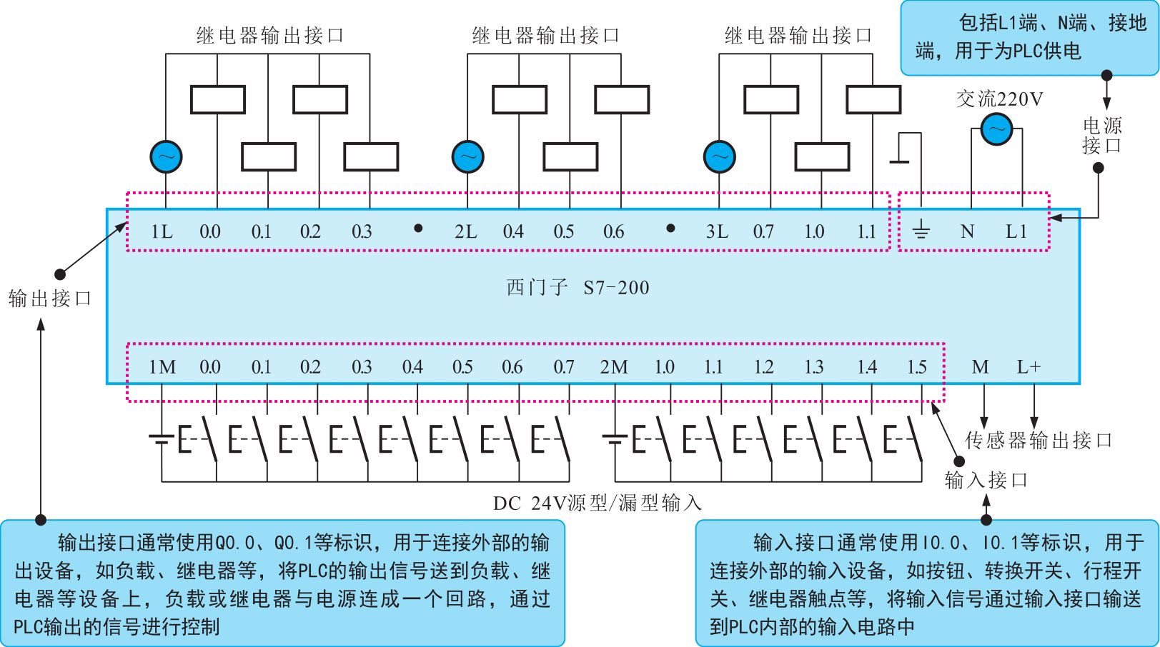 如图2-24所示,电源接口包括L端、N端和接地端,用于为PLC供电;输入接口通常使用I0.0、I0.1等进行标识;输出接口通常使用Q0.0、Q0.1等进行标识。