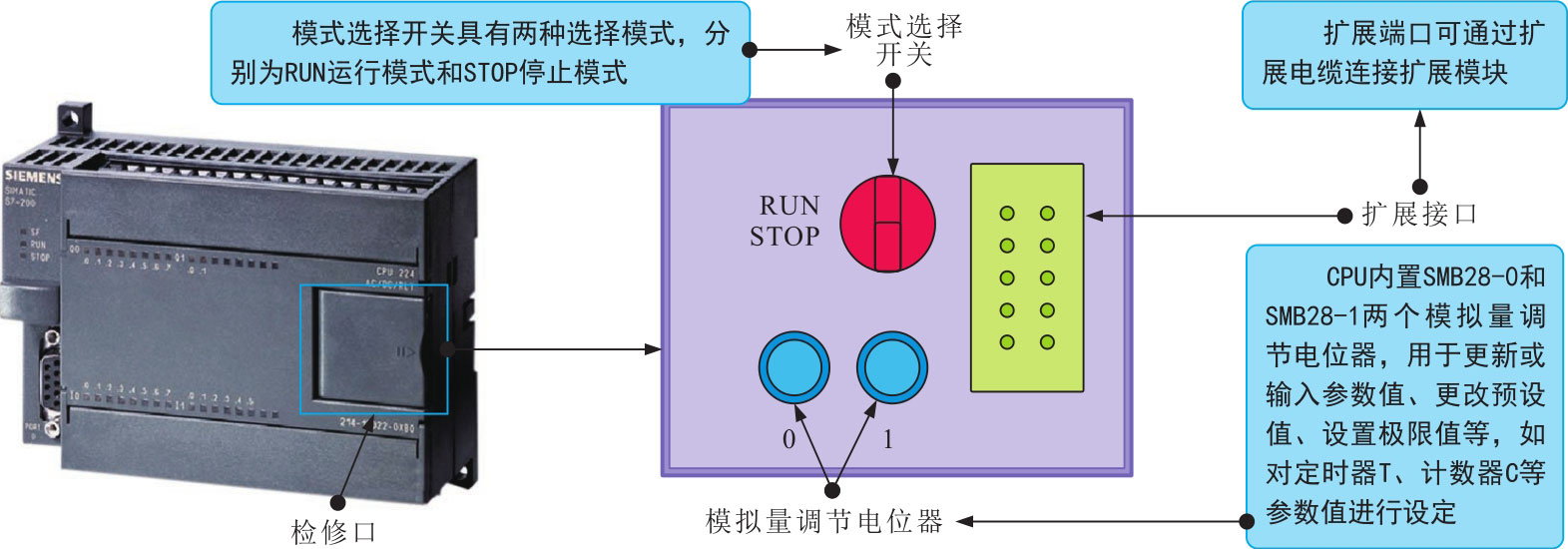 西门子S7系列PLC的检修口包括模式选择开关、模拟量调节电位器和扩展接口,如图2-27所示。