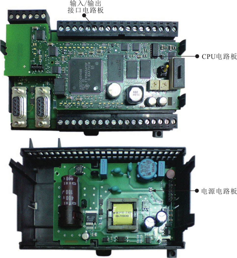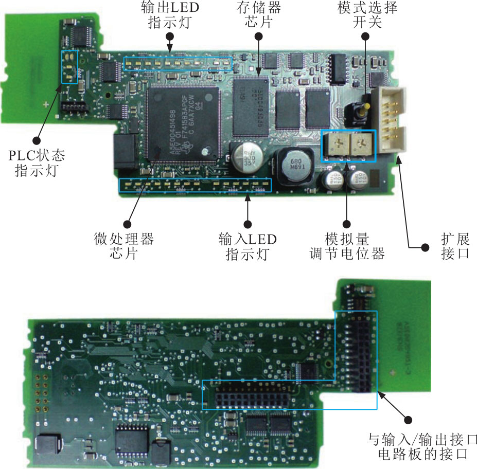 CPU电路板主要由微处理器芯片、存储器芯片、PLC状态指示灯、输出LED指示灯、输入LED指示灯、模式选择开关、模拟量调节电位器、电感器、电容器、与输入/输出接口电路板的接口等构成。