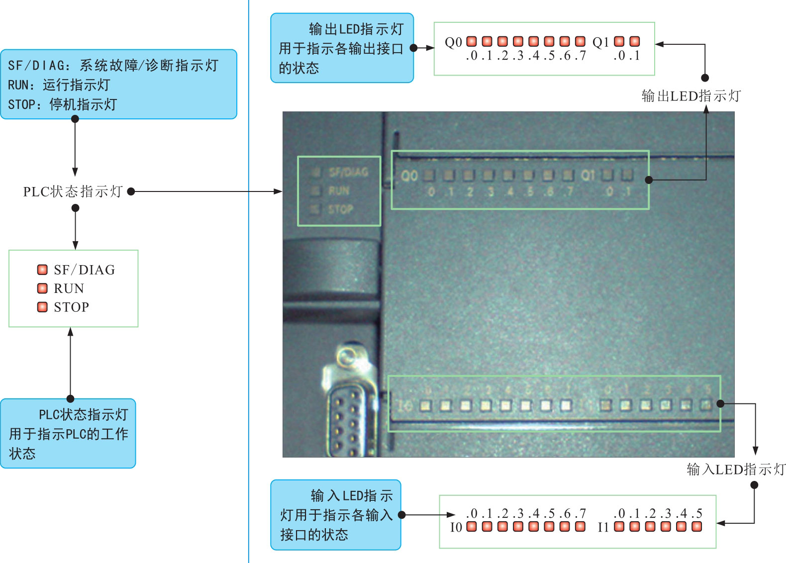 LED指示灯包括PLC状态指示灯、输入指示灯和输出指示灯三部分,如图2-25所示。