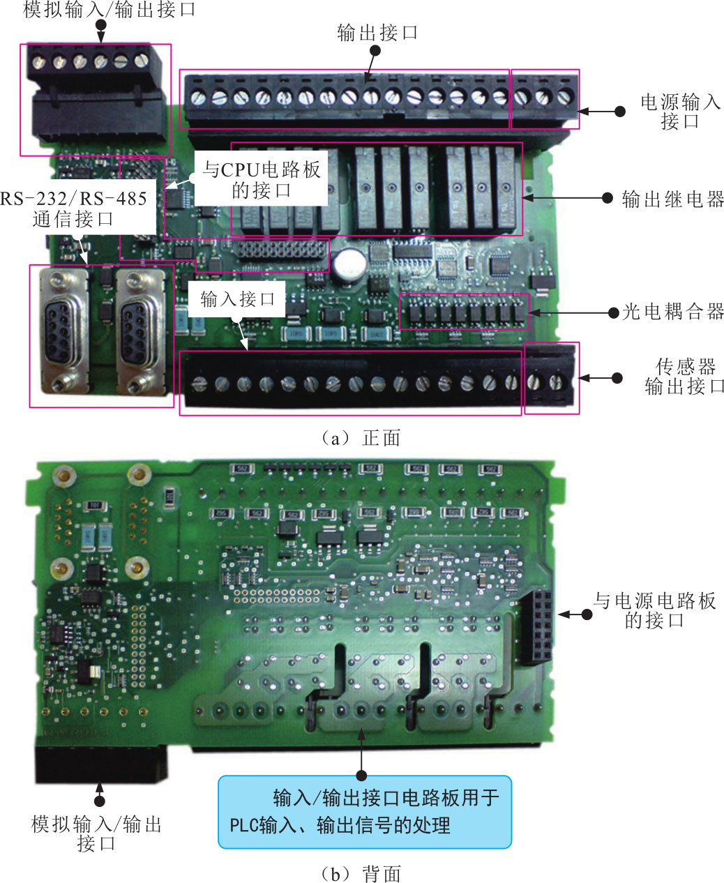 输入/输出接口电路板主要由输入接口、输出接口、电源输入接口、传感器输出接口、与CPU电路板的接口、RS-232/RS-485通信接口、输出继电器、光电耦合器、与电源电路板的接口等构成。