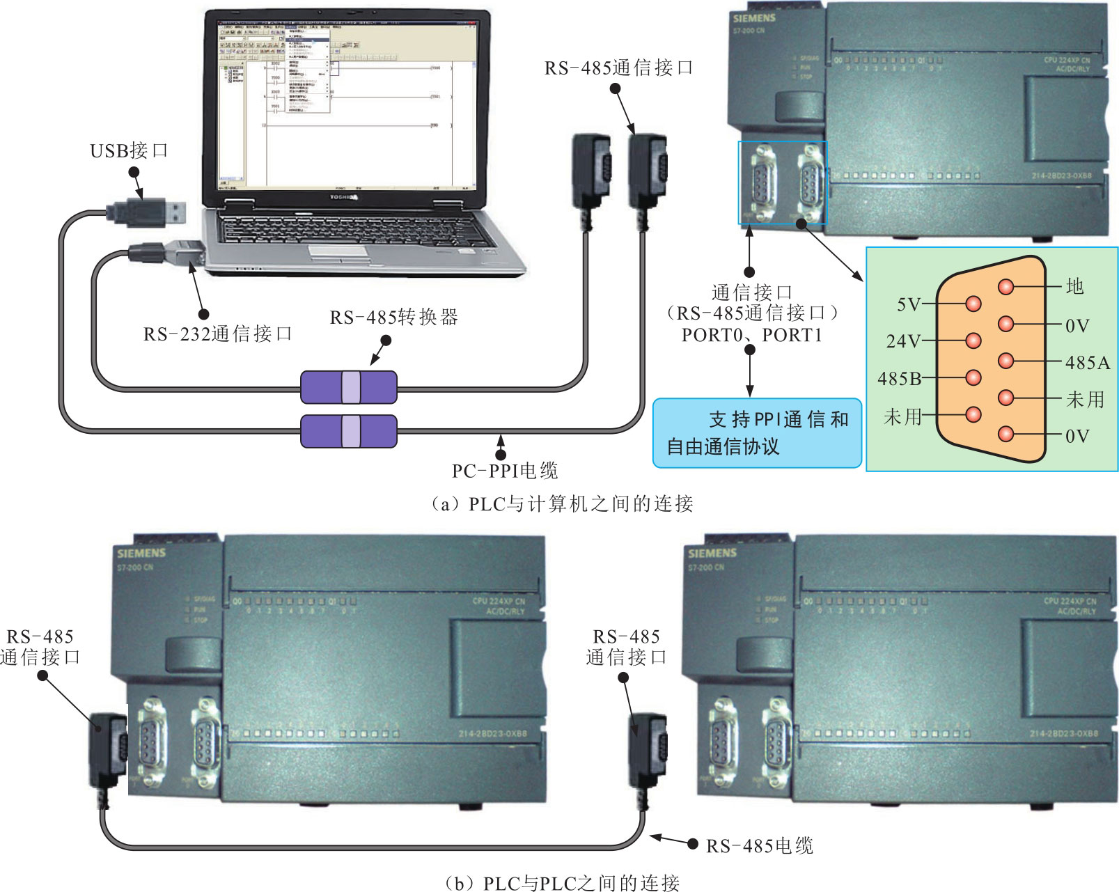 西门子S7系列PLC常采用RS-485通信接口进行连接,支持PPI通信和自由通信协议,如图2-26所示。