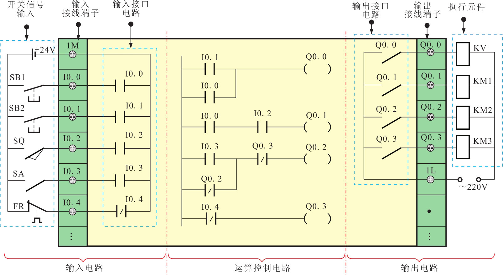 为了更清晰地了解PLC的执行过程,将这一过程等效为三个功能电路,即输入电路、运算控制电路、输出电路,如图2-44所示。