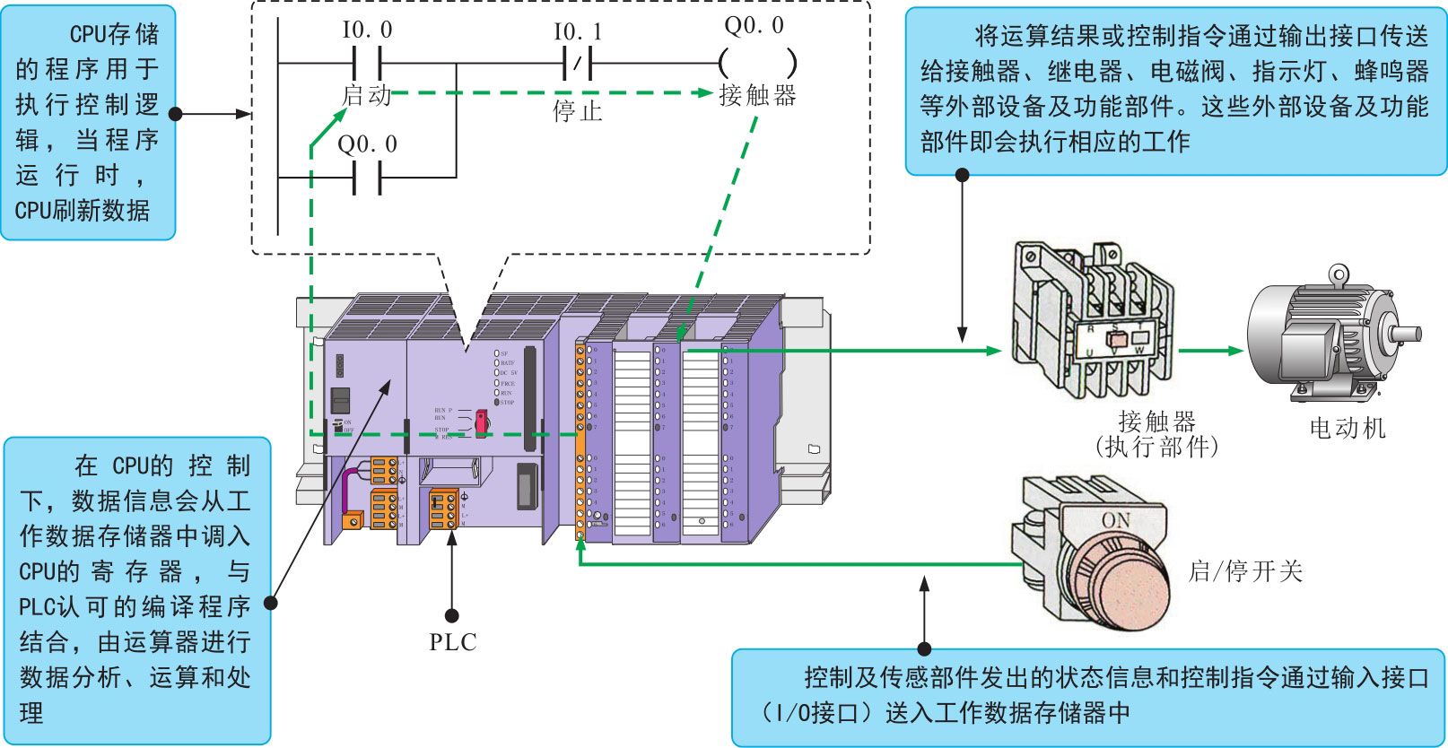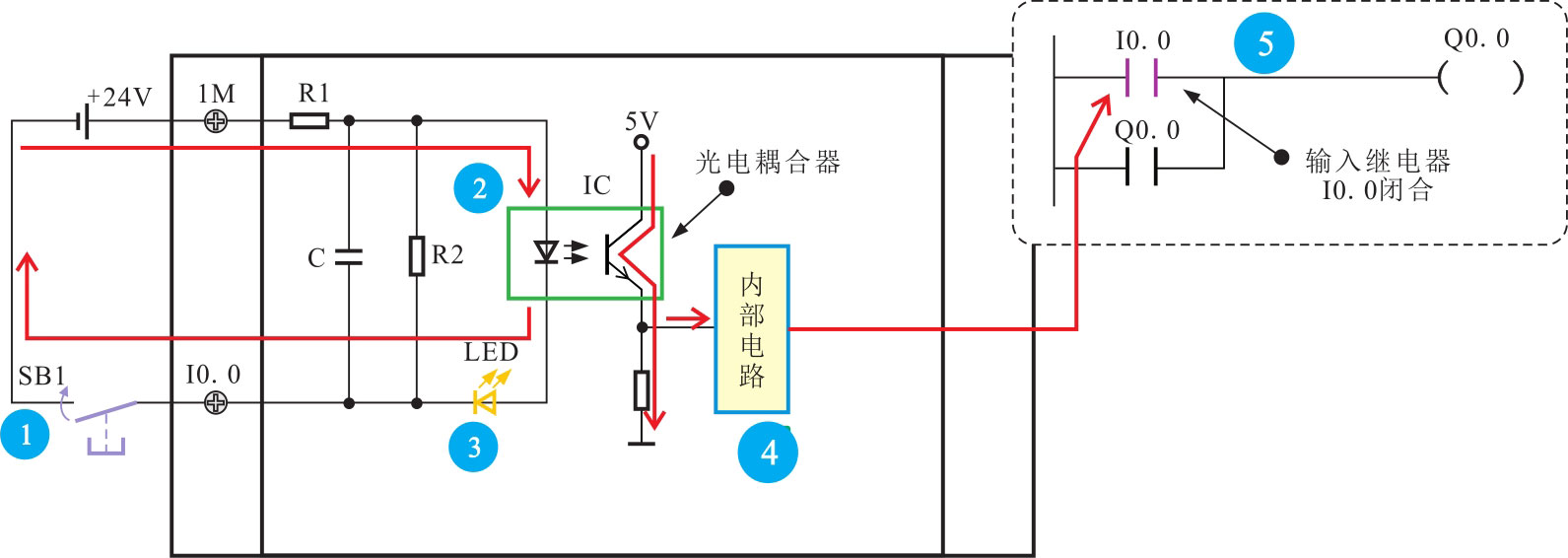 ⑤ CPU识别该信号后,将用户程序中对应的输入继电器触点置1。相反,当按钮SB1断开时,光电耦合器不导通,发光二极管不亮,CPU识别该信号时,将用户程序中对应的输入继电器触点置0。