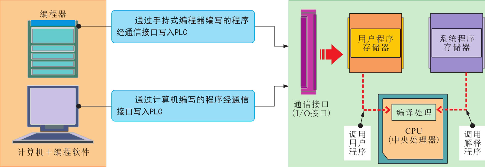 如图2-42所示,将程序写入PLC后,CPU会向存储器发出控制指令,从系统程序存储器中调用解释程序,进一步编译用户程序,使其成为PLC认可的编译程序。
