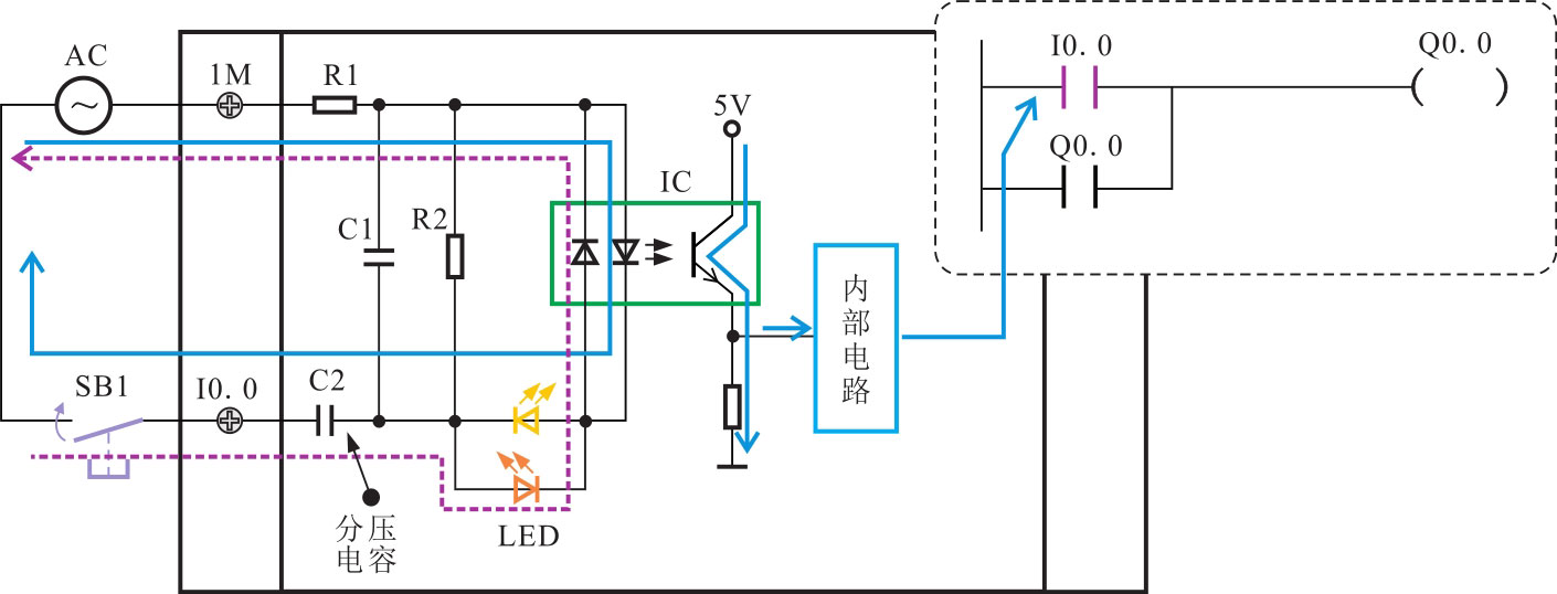 在图2-46中,电容器C2用于隔离交流强电中的直流分量,防止强电干扰损坏PLC。光电耦合器有两个方向相反的发光二极管,任意一个发光二极管导通都可以使光电耦合器中的光敏晶体管导通并输出相应的信号。状态指示灯LED也采用两个反向并联的发光二极管,光电耦合器中任意一个发光二极管导通都能使状态指示灯LED点亮(直流输入电路也可以采用此结构,外接直流电源时可不用考虑极性)。