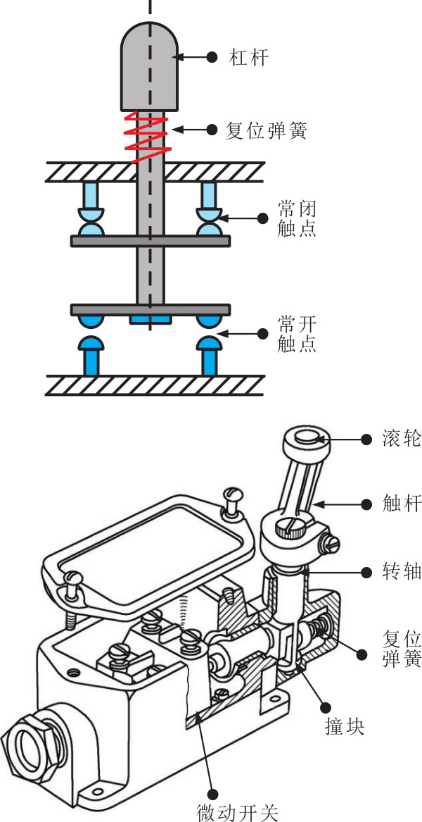 图3-11为常见的限位开关。限位开关根据类型不同,内部结构也有所不同,但基本都是由杠杆(或滚轮及触杆)、复位弹簧、常开/常闭触点等部分构成的。
