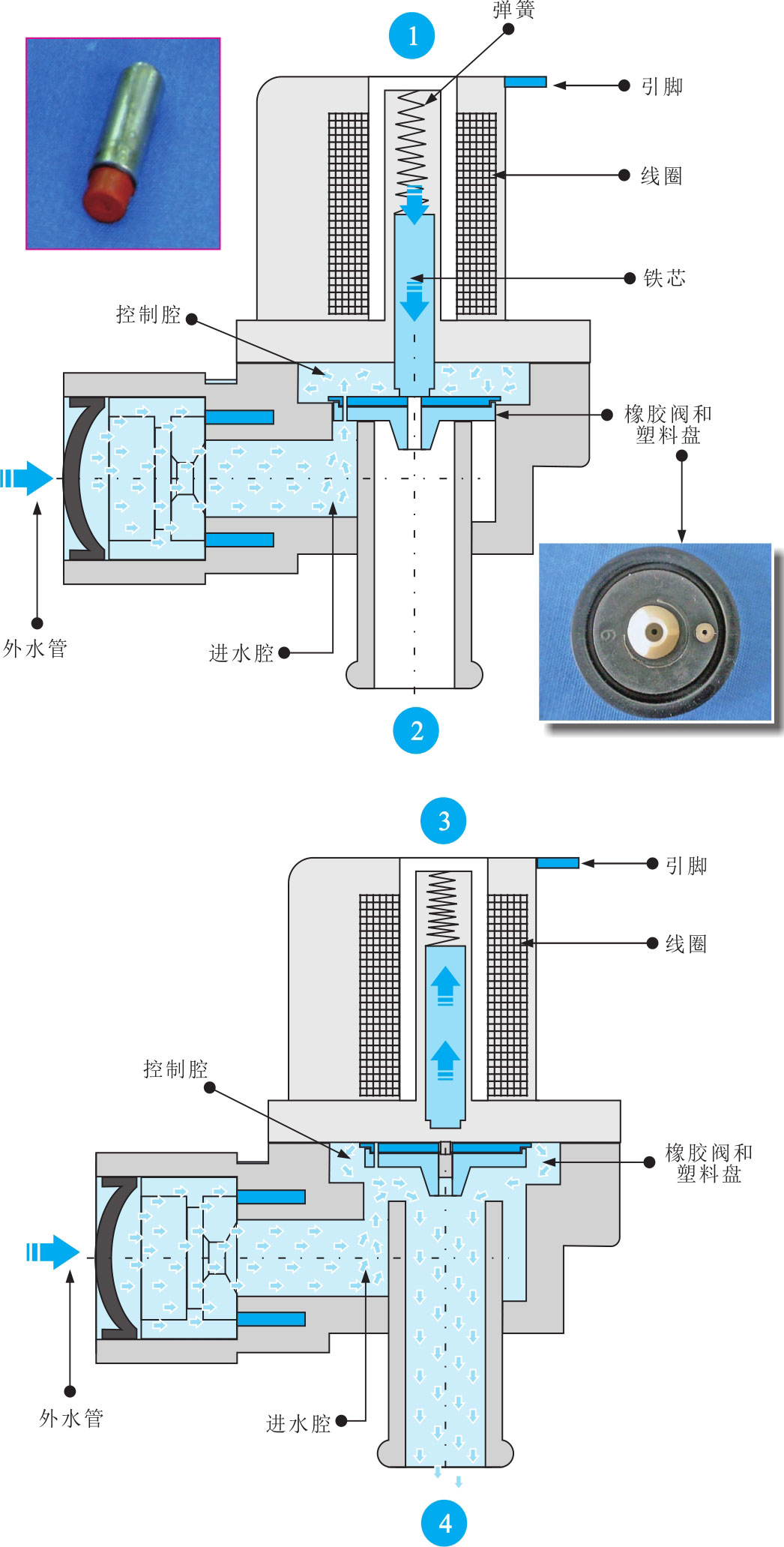 ② 控制腔的压力大于出水口一侧的压力,橡胶阀被紧紧地压住,水不能流入。