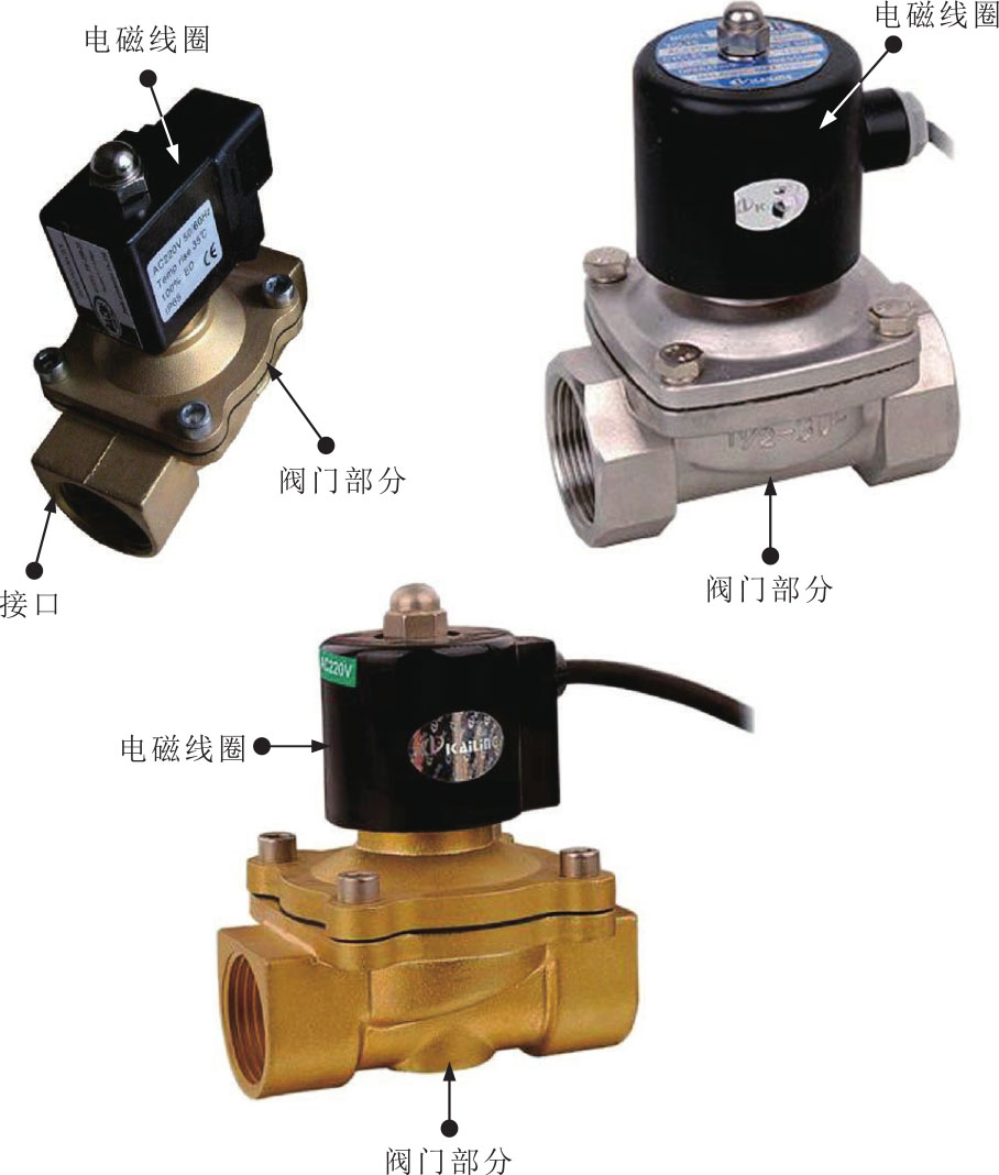 电磁阀的种类多种多样,具体的控制过程也不相同。以常见给排水用的弯体式电磁阀为例。电磁阀工作的过程就是通过电磁阀线圈的得电、失电来控制内部机械阀门开、闭的过程,如图3-27所示。