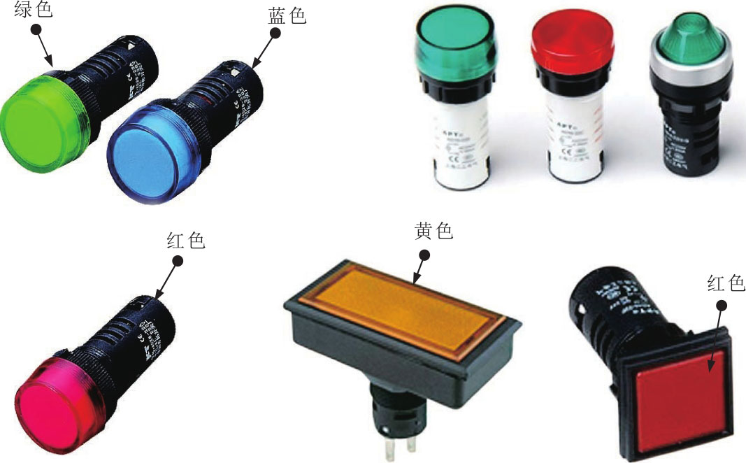 指示灯是一种具有指示线路或设备的运行状态、警示等作用的指示部件。图3-28为典型指示灯的实物外形。