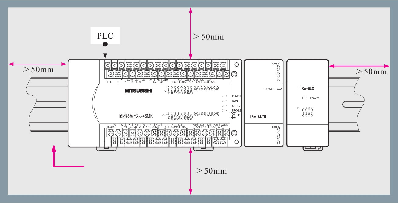 为了保证PLC工作时的温度在规定的环境温度范围内,PLC控制柜应有足够的通风空间,如果环境温度超过55℃,则应安装通风风扇,强制通风。