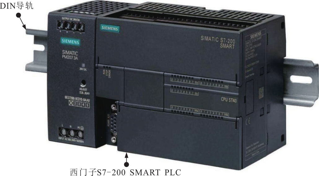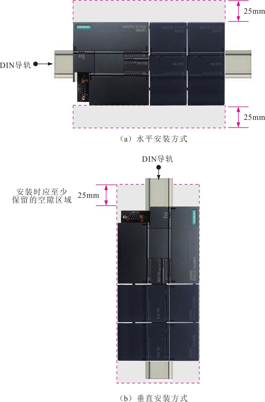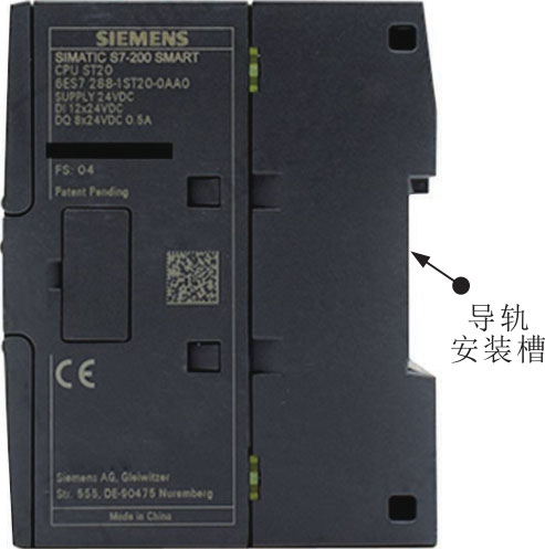 DIN导轨安装方式是指利用PLC底部外壳上的导轨安装槽及卡扣将PLC安装在DIN导轨上,如图4-16所示。