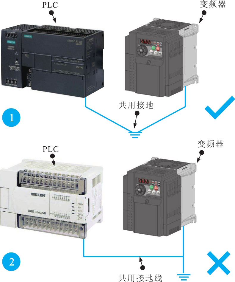 ② 严禁将PLC的接地线与其他设备的接地线连接,采用共用接地线的方法接地。