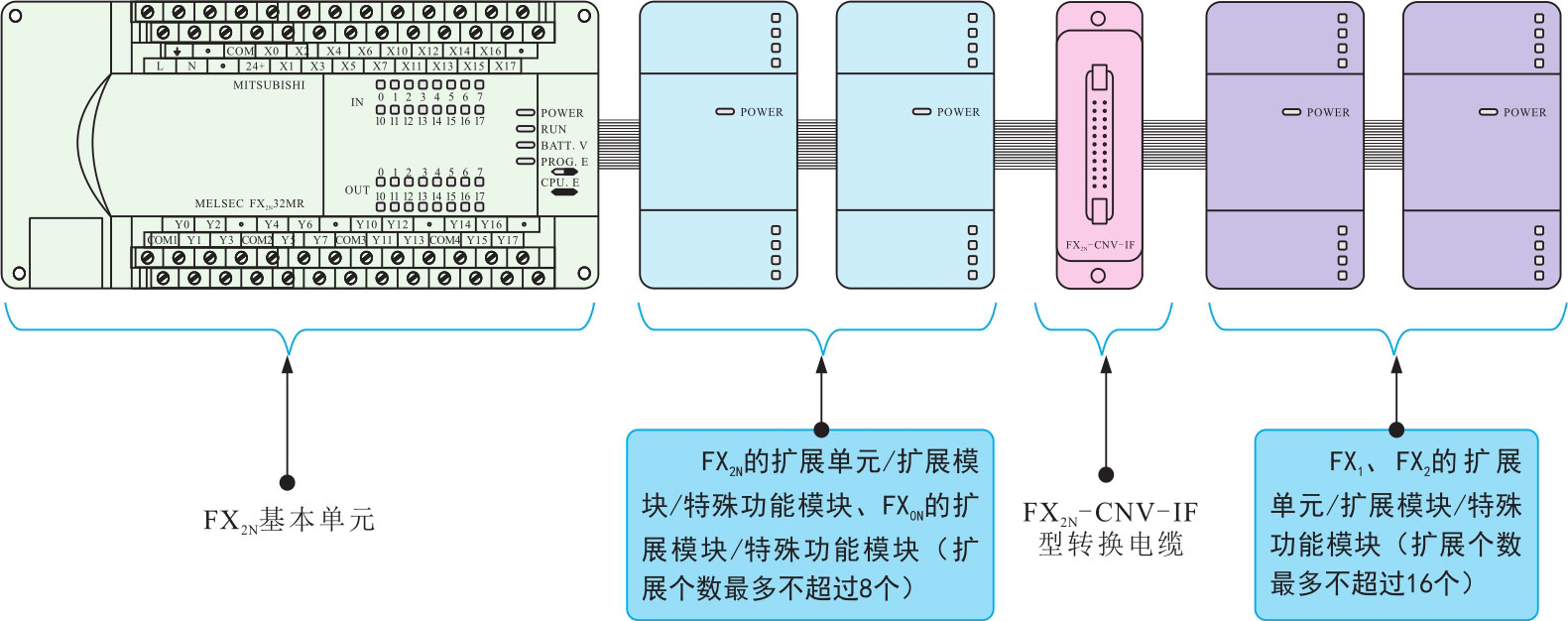 如图4-24所示,当FX 2N 基本单元与FX 2N 、FX 0N 、FX 1 、FX 2 扩展模块混合连接时,需将FX 2N 、FX 0N 的扩展模块直接与FX 2N 基本单元连接,在FX 2N 、FX 0N 扩展模块后使用FX 2N -CNV-IF型转换电缆连接FX 1 、FX 2 扩展模块,不可反顺序连接。