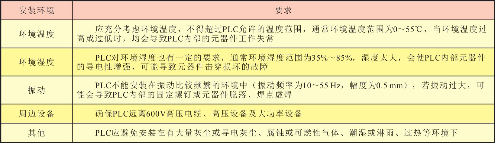 在安装PLC之前,首先要确保安装环境应符合PLC的基本工作需求,包括温度、湿度、振动及周边设备等,见表4-1。