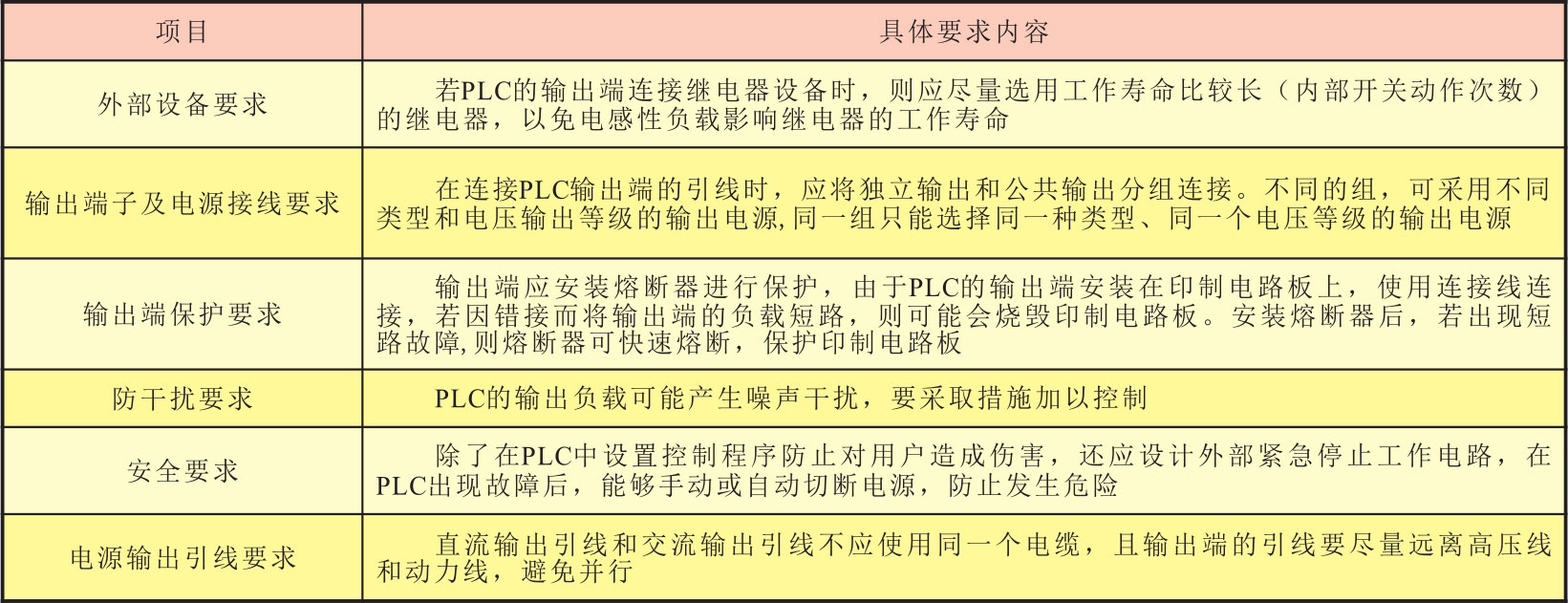 PLC的输出端一般连接控制设备,如继电器、接触器、电磁阀、变频器、指示灯等,在连接输出端的引线或控制设备时应符合PLC输出端的接线要求,见表4-3。