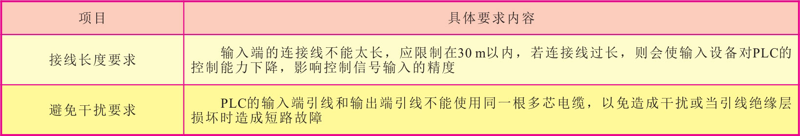 PLC一般使用限位开关、按钮等进行控制,输入端常与外部传感器连接,在对PLC输入端的接口进行接线时,应符合PLC输入端的接线要求,见表4-2。