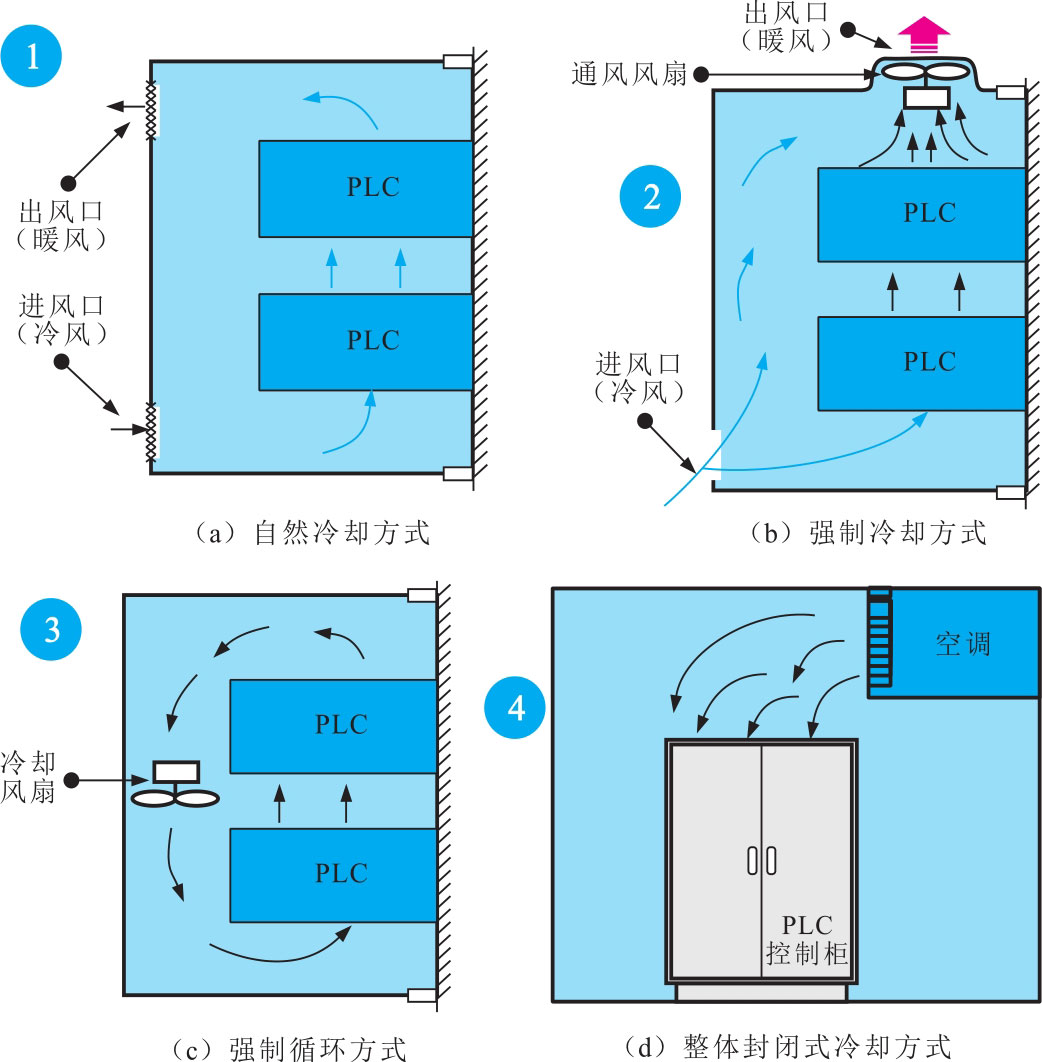 图4-11为PLC控制柜的通风方式。PLC控制柜的通风方式有自然冷却方式、强制冷却方式、强制循环方式和整体封闭式冷却方式。