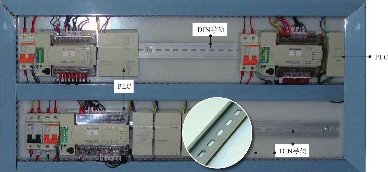 目前,PLC的安装主要分为单排安装和双排安装。为了防止温度升高,PLC应垂直安装,且需要与控制柜箱体保持一定的距离。注意,不允许将PLC安装在封闭空间的地板和天花板上。图4-12为PLC的单排安装。