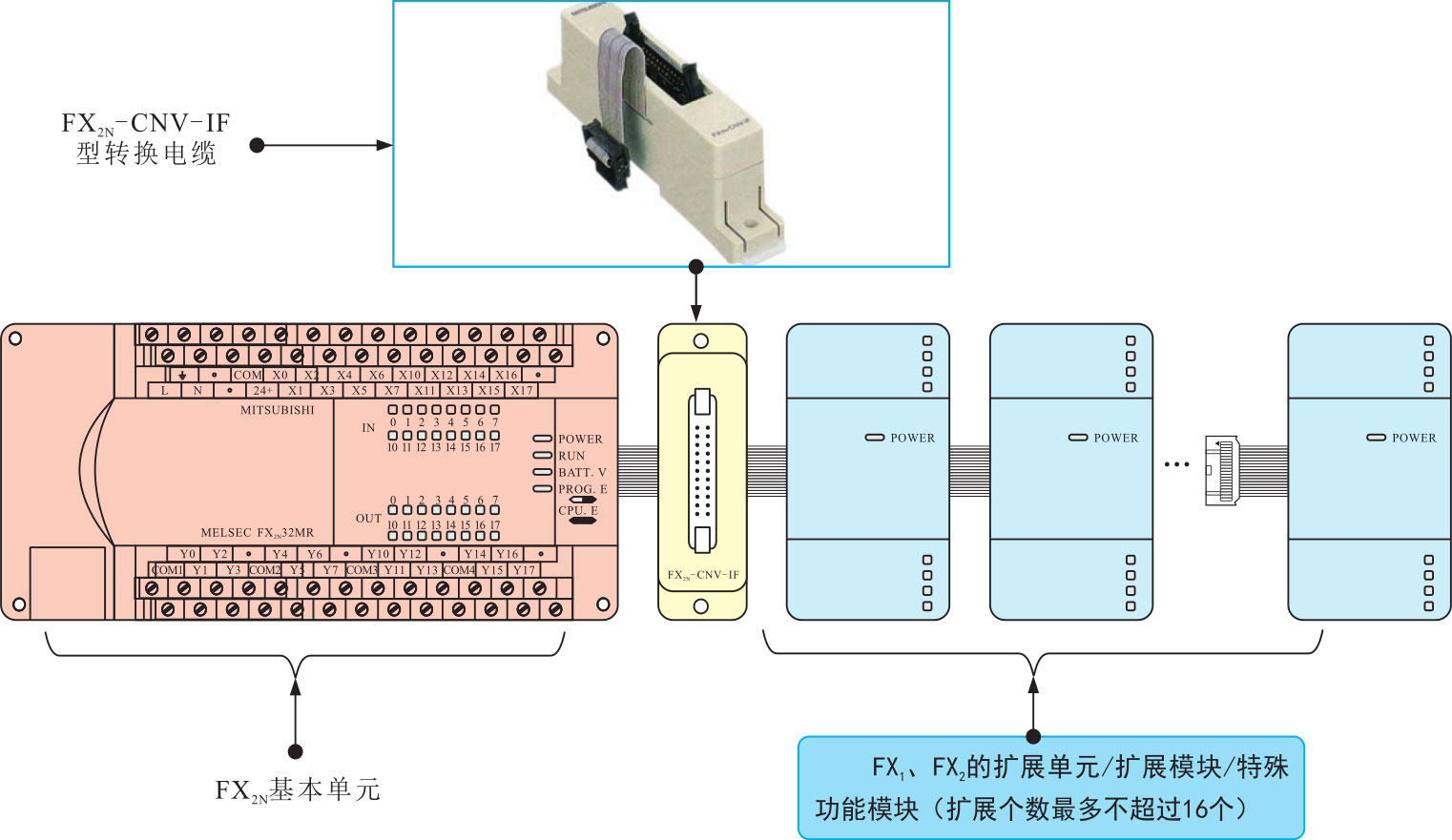 当FX 2N 基本单元的右侧与FX 1 、FX 2 扩展单元、扩展模块、特殊功能模块连接时,需使用FX 2N -CNV-IF型转换电缆进行连接,如图4-23所示。