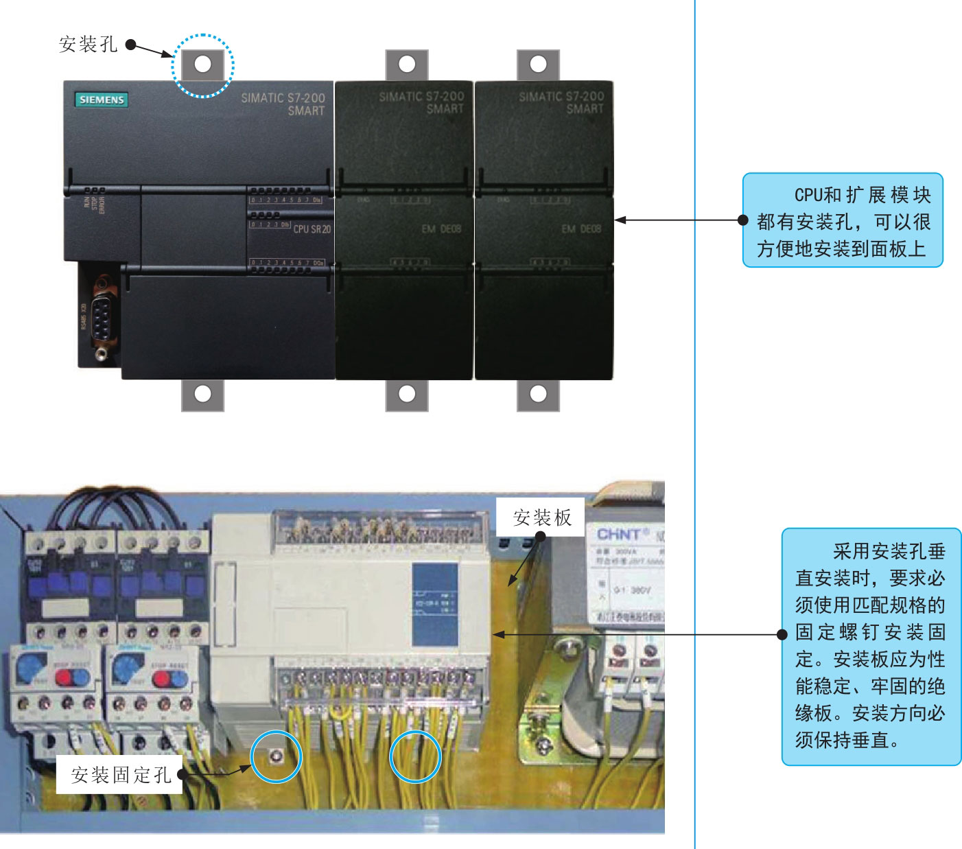 底板安装方式是指利用PLC底部外壳上的4个安装孔进行安装,如图4-15所示。