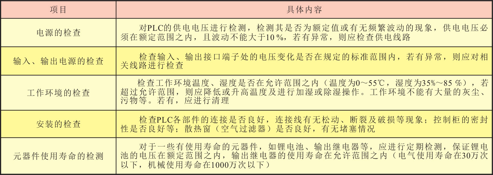 PLC系统的日常维护包括供电条件、工作环境的检查及元器件使用寿命的检测等,见表4-6。