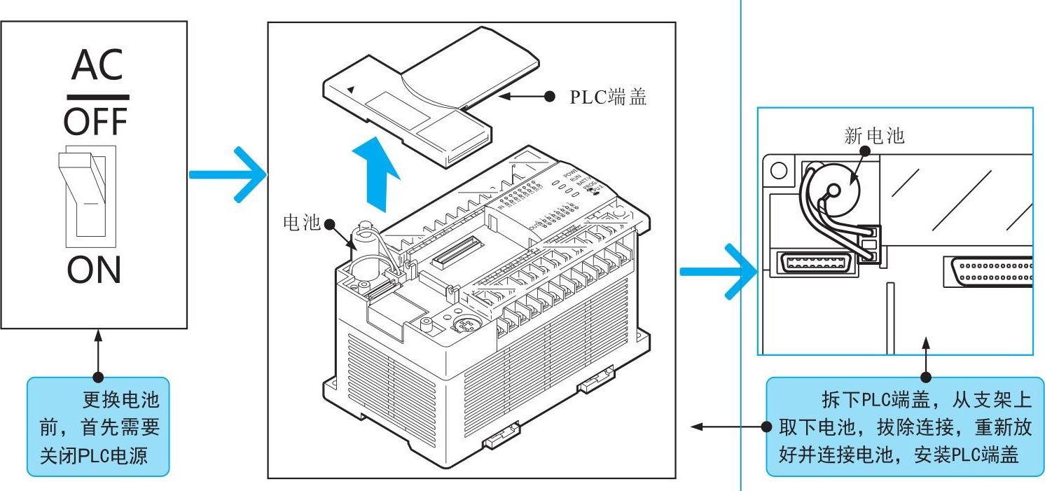 若PLC中的电池达到使用寿命(一般为5年)或电压已下降到一定程度,则应进行更换,如图4-33所示。