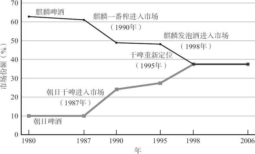 1994年,作为市场唯一干啤品牌生产商的朝日公司,基于其干啤口味清新、日本排名第一以及全球知名的特点,制定了一项非常有力的子类产品定位战略。朝日公司在努力提升其干啤子类产品,与此同时麒麟公司却在破坏其拉格淡啤酒子类产品。也许是被朝日公司“第一生啤”的口号激怒了,麒麟公司也开始转向生啤生产,并且把麒麟拉格更换为“麒麟拉格生啤”(Kirin Lager Draft,原来的拉格淡啤酒更名为“麒麟经典拉格”(Kirin Lager Classic),仍旧在市场上销售,但降级为小众产品)。麒麟公司的本意是利用麒麟拉格生啤加大其对年轻受众的吸引力,但适得其反——它的产品形象变得令人迷惑,导致其核心客户群心生不满。这场1995~1998年发生在拉格啤酒和干啤酒之间的子类产品大战,最终结果是朝日超爽干啤的市场份额增加了8个百分点,攀升至35%,而麒麟啤酒却缩水9个百分点,降至39%。