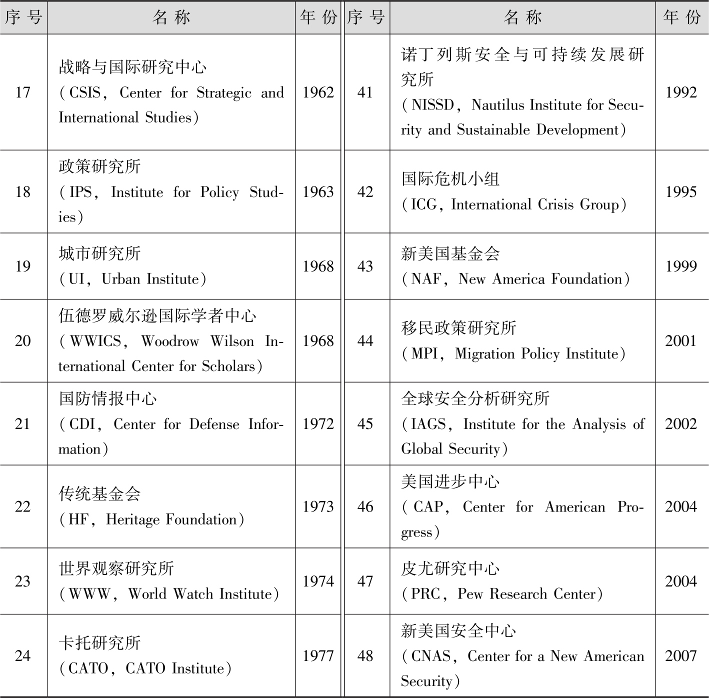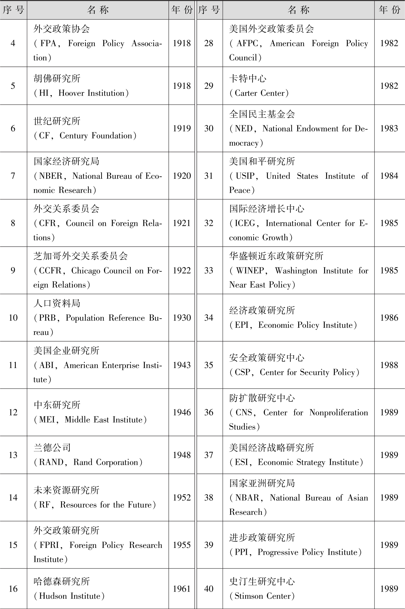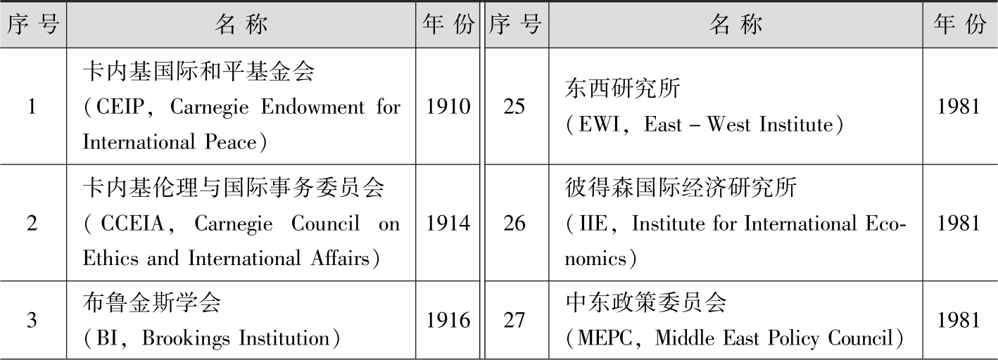 表2-1 美国著名智库建立年代表