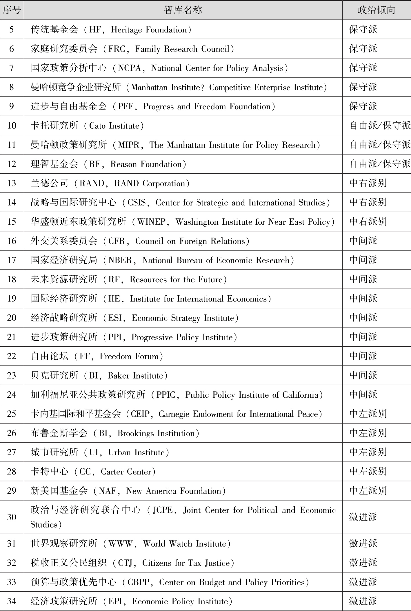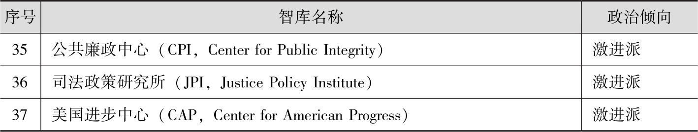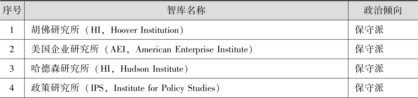 表2-3 美国主要智库政治倾向