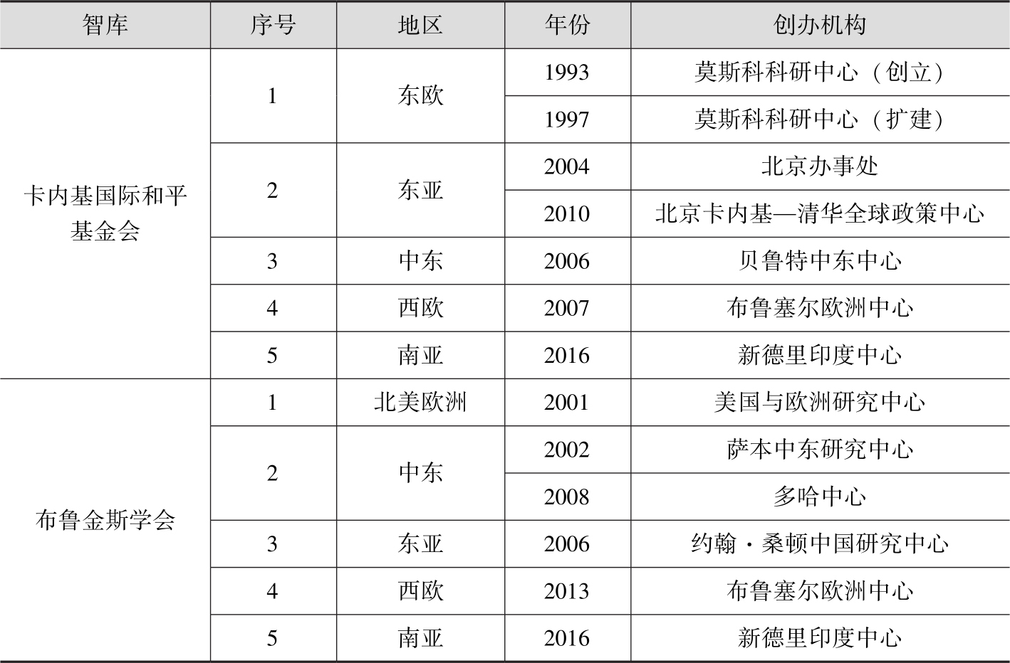 表2-2 卡内基国际和平基金会和布鲁金斯学会国际化网络