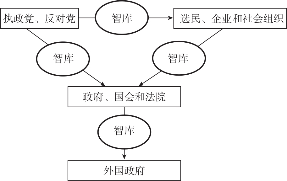 、通过“旋转门”机制为政府提供人才影响决策等方式。同时美国智库在决策过程中多点参与,具体如图2-1所示。