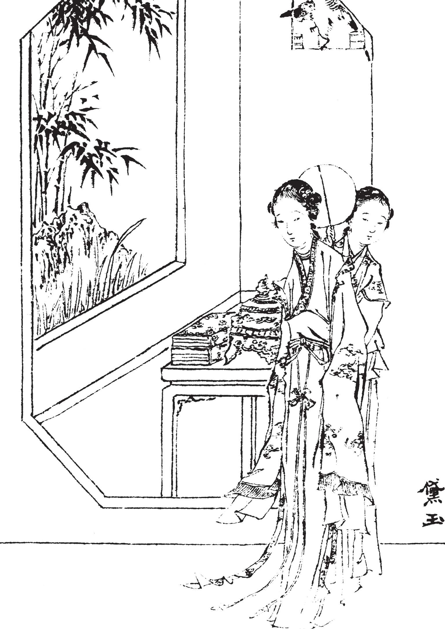 宝玉无精打彩的,只得依她。晃出了房门,顺着来到潇湘馆。宝玉信步走入,只见湘帘垂地,悄无人声。走到窗前,就闻到一缕幽香从碧纱窗中透出。宝玉便将脸贴在纱窗上,往里看时,耳内忽听得细细的长叹了一声道:“‘每日家情思睡昏昏。’”宝玉听了,不觉心内痒将起来,再看时,只见黛玉正坐在床上,伸着懒腰,宝玉在窗外笑说:“为什么‘每日家情思睡昏昏’?”一边说,一边掀开帘子进去了。黛玉一时忘情,不觉红了脸,拿袖子遮着脸,翻身向里装睡着了。宝玉要搬她的身子,只见黛玉的奶娘跟进来说:“妹妹睡觉呢!”刚说着,黛玉忙翻身起来和宝玉说话。只见紫鹃走了进来,宝玉就说:“倒碗好茶来。”紫鹃说:“要好茶喝,等袭人来。”黛玉说:“别理他,给我端洗脸水。”紫鹃说:“他是客人,自然先倒茶,再给你端洗脸水。”说着忙去了。宝玉笑说:“好丫头,‘若共你多情小姐同鸳帐,怎舍得叠被铺床’?”黛玉一听就生气了,说:“看了混账书,也来拿我取笑儿。我成了解闷的了。”一面哭着,一面下床来往外就走。