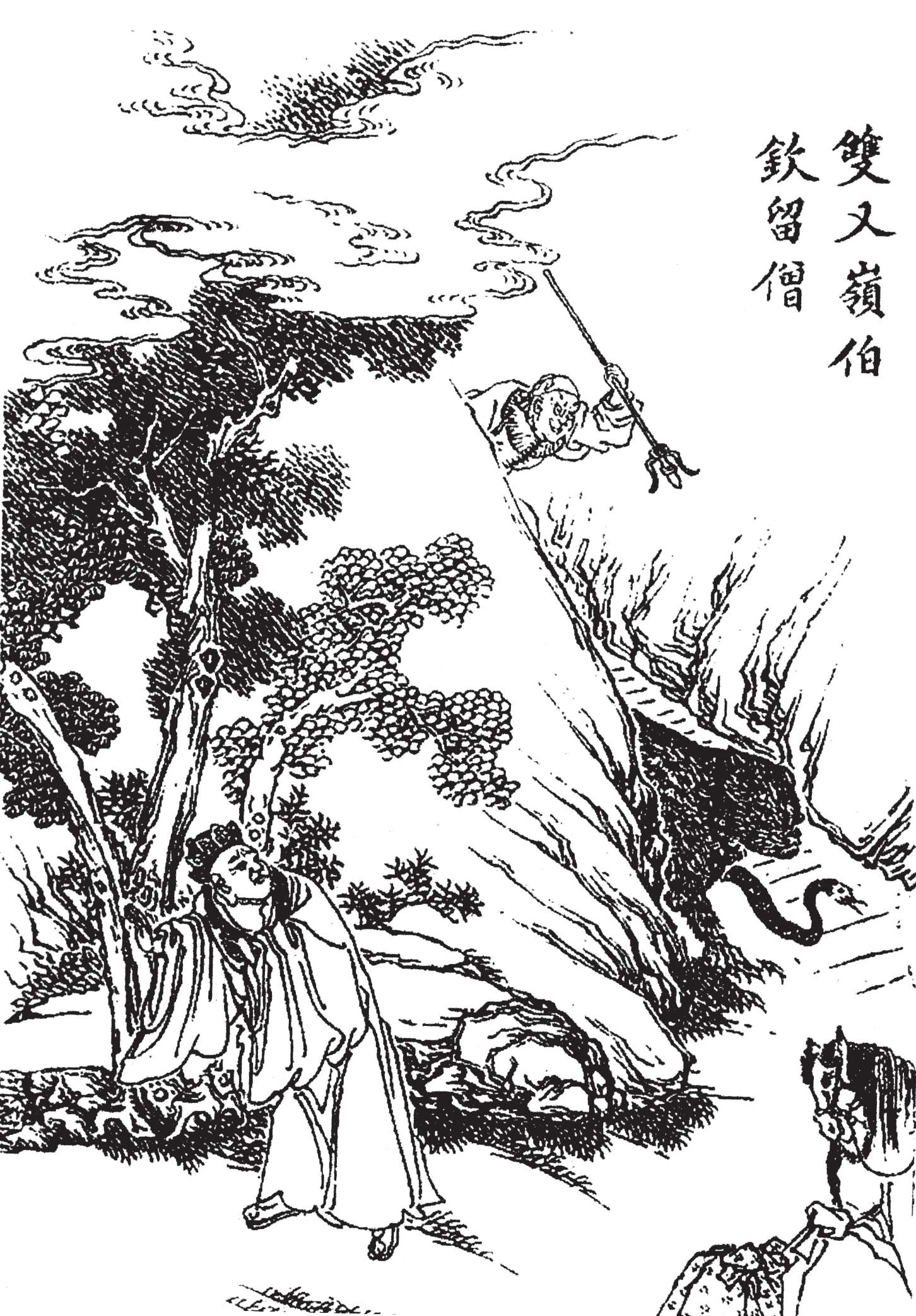 三藏看了,对着天空行礼说:“多谢金星,救我脱难。”拜完,他牵着马,一个人孤零零地往前走。走了半天,也不见有村舍。三藏饿了,路又不好走,却又遇到两只猛虎咆哮而来,后边还有几条长蛇盘绕。三藏只好听天由命,那马也吓得跪下了,牵也牵不动。三藏心想,自己就要被老虎吃了。想不到老虎和毒蛇都跑了,抬头一看,来了一个人,手里拿着钢叉,腰上挂着弓箭。三藏见那人走近了,跪在路边,合掌高叫:“大王救命!”那条汉子来到近前,放下钢叉,用手搀起三藏说:“长老不要怕。我不是坏人,我是这山里的猎户,姓刘名伯钦,绰号镇山太保。我来山里,本想打些猎物食用,想不到遇见了你。”三藏说:“贫僧是大唐皇帝派出前往西天拜佛求经的和尚。刚来到这里,遇到些狼虎蛇虫,多亏太保来了,野兽都吓跑了,救了我的命,多谢!”伯钦说:“我在这里住,专门打山里的狼虎,所以野兽都怕我。你既是唐朝来的,和我是一个国家的,这里还是大唐的地界,我也是唐朝的百姓。你不用怕,跟我来,到我家里休息一下,明天我送你上路。”三藏听了,非常高兴,谢了伯钦,牵马跟着他前行。