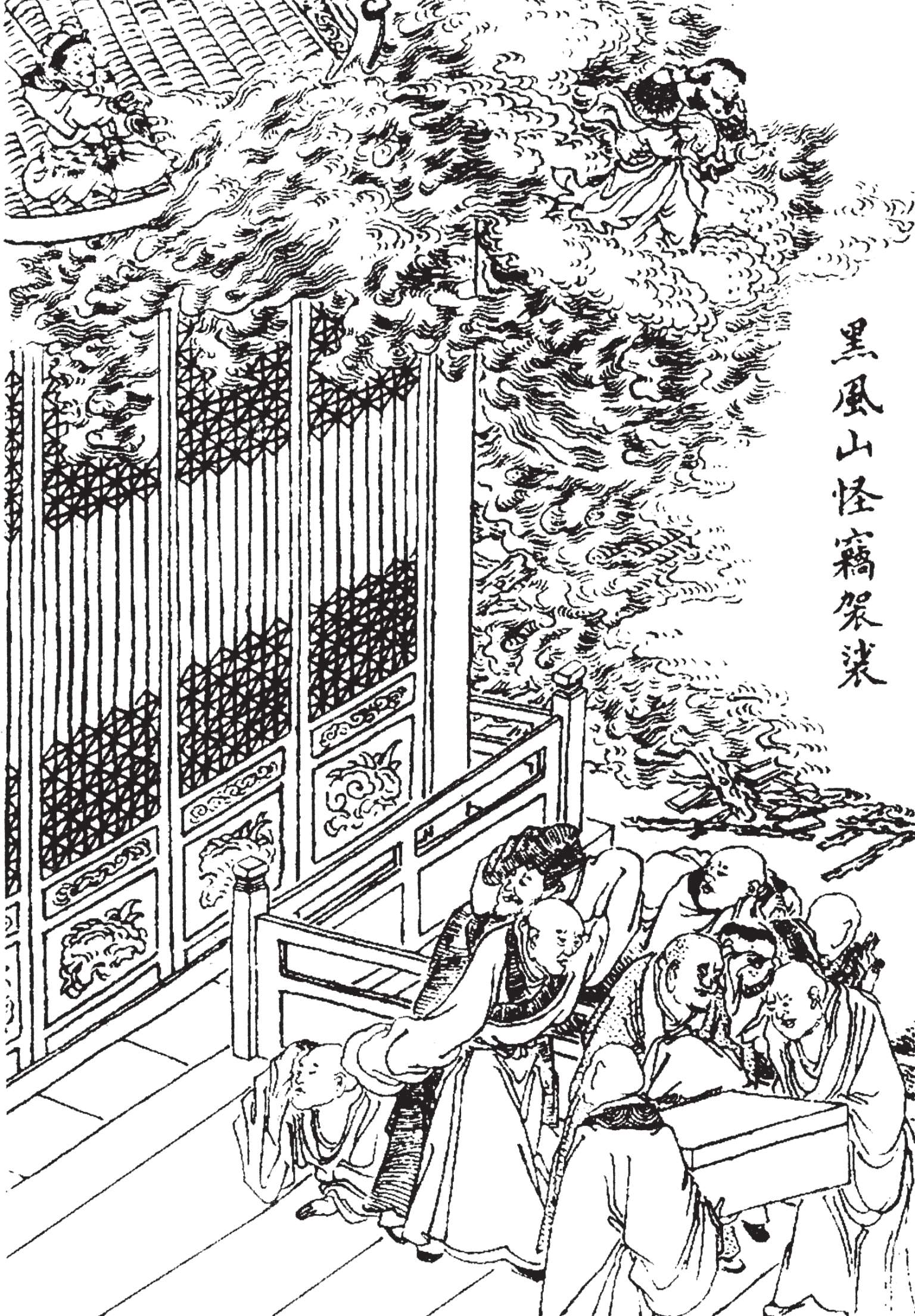 想不到这火惊动山里的兽怪。在观音院正南二十里有座黑风山,山中有一个黑风洞,洞中有一个妖精。这妖精看见正北的火光,大惊道:“这是观音院失火了!这些和尚太粗心了!我去救救他们。”他纵起云头,来到烟火处,看见那后房没有火,房脊上有一个人在放风。他走到里面一看,只见方丈中间有些霞光,桌子上放着一个包袱,解开一看,是一领锦襕袈裟。他知道这是佛门的宝贝,就不救火了,拿起袈裟,回到山中。那场火一直烧到天亮才停,那些和尚都哭哭啼啼的,乱嚷乱闹。