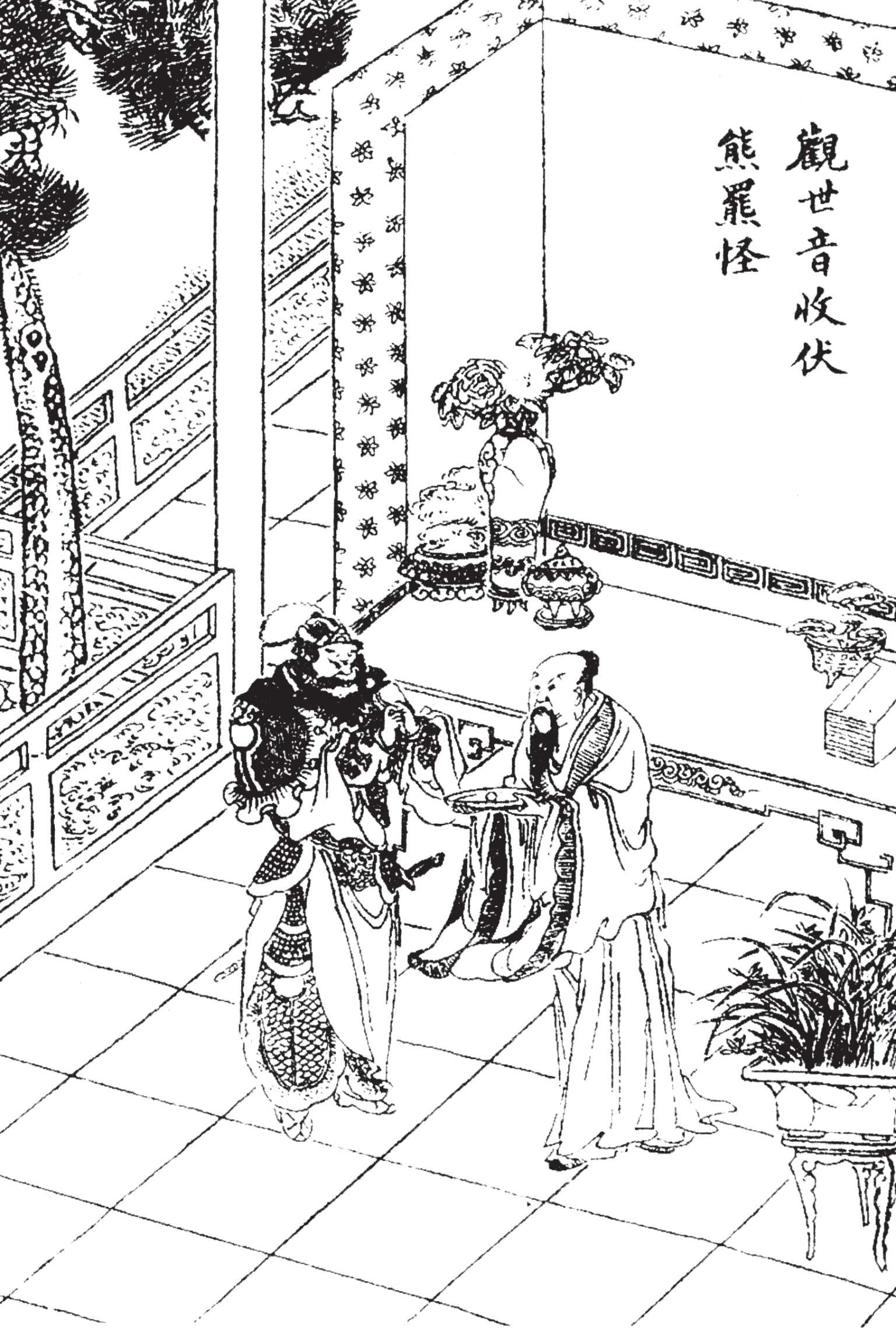 行者看了说:“妙!”自己变成了一粒仙丹,略大一些。菩萨认准了,就拿着玻璃盘,来到妖洞门口。守洞的小妖见了都说:“凌虚仙人来了。”就跑进去报信。那黑熊怪迎出二门,说:“凌虚子,有劳前来。”菩萨说:“小道敬献一粒仙丹,给大王祝寿。”看准那粒大的递给那妖怪说:“祝大王长寿!”那妖怪才要咽下,那药却自己滚入口中。行者在妖怪的肚子里乱打,那妖怪疼得滚倒在地上。菩萨现出真身,向妖怪要回了袈裟。行者便从妖怪的鼻孔中出去了。菩萨又怕那妖怪无礼,把一个箍儿丢在那妖怪头上。那妖怪起来,提起枪要反抗。行者和菩萨早已升到空中,菩萨念起真言,那怪头疼,丢下枪满地乱滚。菩萨问道:“你愿意归顺吗?”那妖怪说:“愿意,只求饶命!”行者要过去打,菩萨叫住他说:“不要伤他,我有用他的地方。”行者说:“这样的妖怪留着有什么用?”菩萨说:“我那落伽山后没有人看管,我要带他去做个守山大神。”行者笑着说:“菩萨真慈悲,如果老孙会这样的咒语,就念上千遍!”那妖怪醒了,忍不住疼痛,跪在地下哀求说:“只要饶了性命,愿意归顺!”菩萨落下云头,给那妖怪摩顶受戒,让他拿着长枪,跟随在自己身边。菩萨吩咐说:“悟空,你回去吧,好好服侍唐僧。”行者说:“多谢菩萨。”菩萨带着熊罴回了大海。
