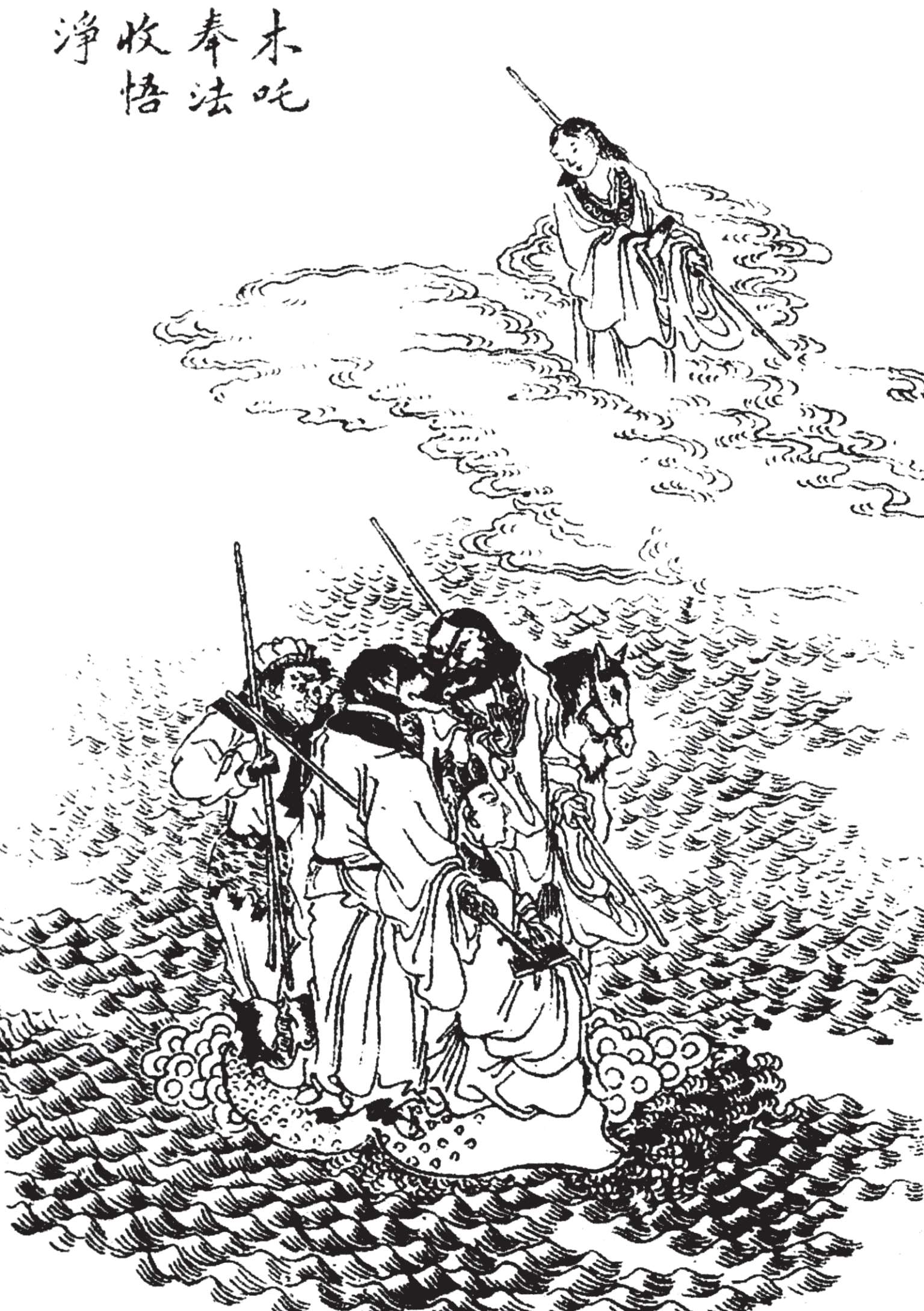 那妖怪正在水底休息,听到有人叫他法名,知道是观音菩萨,又听说“取经人在这里”,他就从水中伸出头来,看见木叉行者,于是笑盈盈地上前行礼,问道:“尊者好,菩萨在哪里?”木叉说:“我师父不曾来,派我来吩咐你早日跟随唐僧,还叫把你项下挂的骷髅和这个葫芦按九宫结成法船,渡唐僧过河。”悟净说:“取经的人在哪里?”木叉用手指着说:“那东岸上坐的就是。”悟净看见八戒,说:“他也不知从哪里来的,和我整整打了两天,也没说过一个取经的字?”又看见行者,说:“这是他的帮手,更厉害!我不去。”木叉说:“那是猪八戒,这是孙行者,都是唐僧的徒弟,也都是受菩萨教诲保护唐僧取经的,不要怕。我带你去见唐僧。”悟净这才收了宝杖,整理了衣服,跳到岸上,在唐僧面前跪下,说:“师父,弟子有眼无珠,不认得师父,冲撞了您,请恕罪。”三藏说:“你果真肯诚心归依吗?”悟净说:“弟子受菩萨教诲,指河为姓,给我起了法名,叫沙悟净,哪里有不归顺师父的道理!”三藏说:“既然是这样,悟空,取戒刀来,我给他落发。”大圣将戒刀给师父,三藏给悟净剃了头。悟净再次拜了三藏,又拜了行者和八戒。三藏见他行礼的样子确实有和尚的风范,就又叫他沙和尚。木叉说:“既然已经归顺,快做法船。”悟净就取下颈项下挂的骷髅,结作九宫,把菩萨的葫芦安在当中,便请师父过河。长老于是登上法船,坐在上面,果然像船一样稳。八戒在左,悟净在右,孙行者在后面牵着龙马,半云半雾相跟;头上又有木叉拥护;三藏才渡过了流沙河。等师徒们上了岸,木叉按落祥云,收了葫芦,那些骷髅化作九股阴风不见了。三藏拜谢了木叉,又拜南方感谢了菩萨。