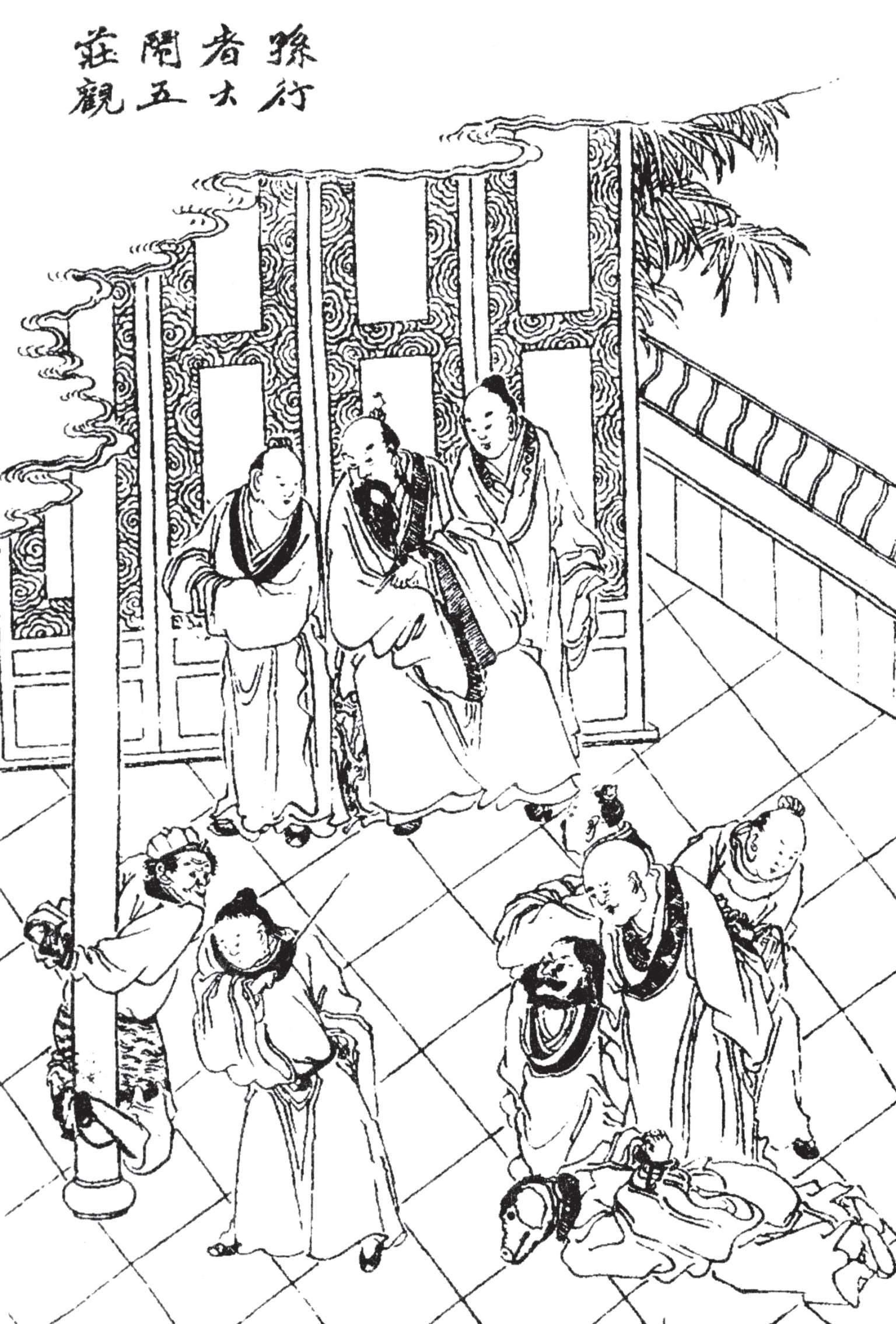 大仙驾祥云回到五庄观坐下,叫徒弟拿绳子来。众小仙在旁伺候。他从袖子里先把唐僧拿出来,绑在正殿的檐柱上,又拿出行者等三人,每一根柱上绑一个;又将马拿出来,拴在庭下,给他些草料吃;将行李扔在廊下。又说:“徒弟们,取出皮鞭来,打这和尚一顿,替我的人参果树出气!”众仙取来一条龙皮做的七星鞭,泡在水里。挑了一个有力气的小仙,拿着鞭子说:“师父,先打哪个?”大仙说:“唐三藏是师父,责任最大,先打他。”行者听了,心中暗想:“老和尚不禁打,如果一顿鞭打坏了,就是我造的业障。”他忍不住,大声说:“先生说错了。偷果子的是我,吃果子的也是我,推倒树的还是我,应该先打我。”大仙笑着说:“这泼猴说得也有理,那就先打他。”小仙问:“打多少?”大仙说:“按果子的数目,打三十鞭。”那小仙抡鞭就打。行者看他要打腿,就叫了声“变!”将两条腿都变成熟铁腿。那小仙打完了三十下,快到中午了。大仙又吩咐道:“还要打唐三藏。”行者说:“先生又错了。偷果子时,我师父不知道。就算有教训不严的过错,我是弟子,也应该替打。”大仙笑着说:“这泼猴虽然狡猾,却也有些孝心。那就还打他。”小仙又打了三十鞭。这时天快黑了,大仙说:“先把鞭子泡在水里,等明天再接着打。”小仙们收了鞭子,各自回房。吃了晚斋,都睡下了。三藏双眼垂泪,埋怨三个徒弟说:“你们闯了祸,却连累我受罪。”行者说:“先不要抱怨,打也是先打我,你又没被打。”唐僧说:“虽然没挨打,也被绑得身上疼啊。”沙僧说:“师父,这儿还有陪绑的呢。”行者说:“都不要嚷,一会儿我们就走。”好行者,把身子变小了一点,从绳索中脱身出来,解了三藏,放下八戒、沙僧,牵过马,到廊下拿了行李,带着众人出了观门。他对八戒说:“你去那崖边伐四棵柳树。”八戒有些力气,一嘴一棵,拱了四棵树,一起抱来。行者折断枝梢,和八戒一起回到观中,用绳子将树绑在柱上。大圣念动咒语,咬破舌尖,将血喷在树上,叫声:“变!”四根树干变成师徒四人,有人问也就答话。他二人赶上师父,这一夜仍旧马不停蹄地跑,天亮时,三藏困得在马上打盹。行者见了,就说:“师父怎么一夜都坚持不了?我老孙就是一千天不睡觉,也不困。先下马休息一会儿,不要让走路的人看见了笑你。”