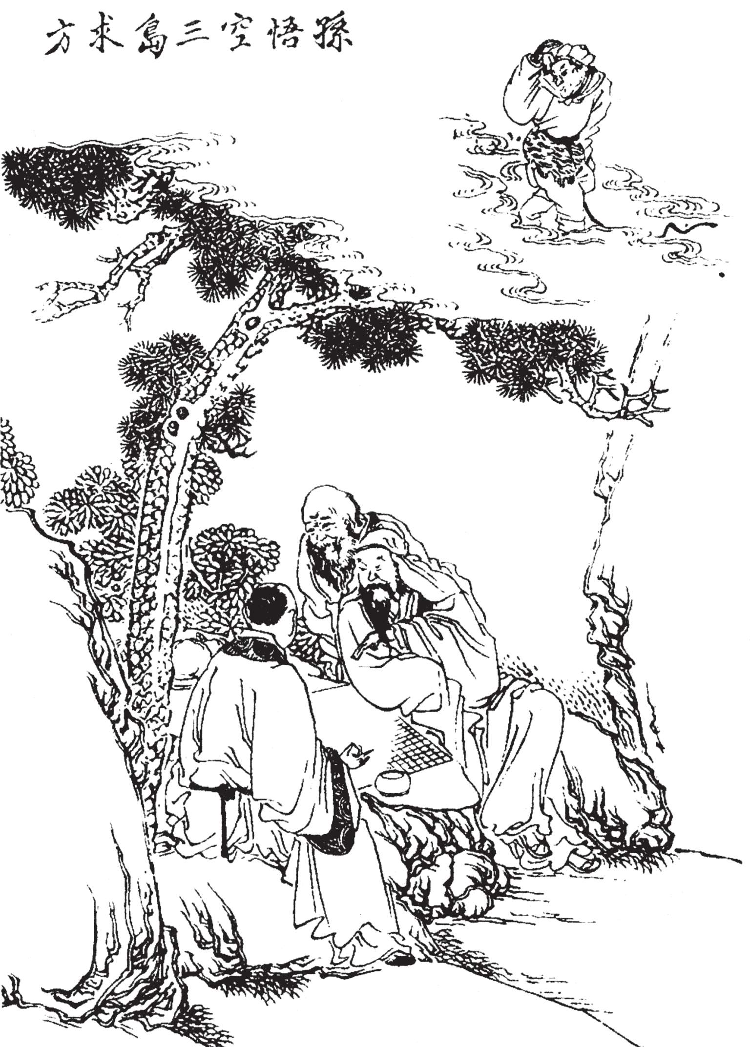 行者离开五庄观,纵筋斗云前往东洋大海。到了蓬莱仙境,按下云头,来到白云洞外,见松阴之下,有三个老人在下围棋:一旁观看的是寿星,对局的是福星、禄星。行者走过去叫道:“几位老弟,有礼了。”三星见了,急忙回礼说:“大圣从哪里来?”行者说:“特来找你们一起玩。”寿星说:“我听说大圣正保护唐僧往西天取经,怎么有空儿来玩?”行者说:“不瞒各位,老孙在往西方的路上,遇到些阻碍,特来找你们帮忙。”福星说:“在哪里?遇到了什么阻碍?”行者说:“我们路过万寿山五庄观,遇到了点儿阻碍。”三老惊讶地说:“你难道偷吃了人参果,那树可是天下的灵根!”行者说:“灵根!我已经弄了他个断根!”就把怎么推倒果树的经过讲了一遍。又说:“镇元大仙回来后,把我们捉了去,后来要将我下油锅。我想了个办法脱身逃了,把他的锅也打破了。他见不能捉住我,也没办法。我又和他约定好,让他放了我师父、师弟,我替他医活果树。我想着海上一定有医树的方子,就来问问三位老弟,你们如果有医树的方儿,告诉我,好救唐僧脱离苦难。”