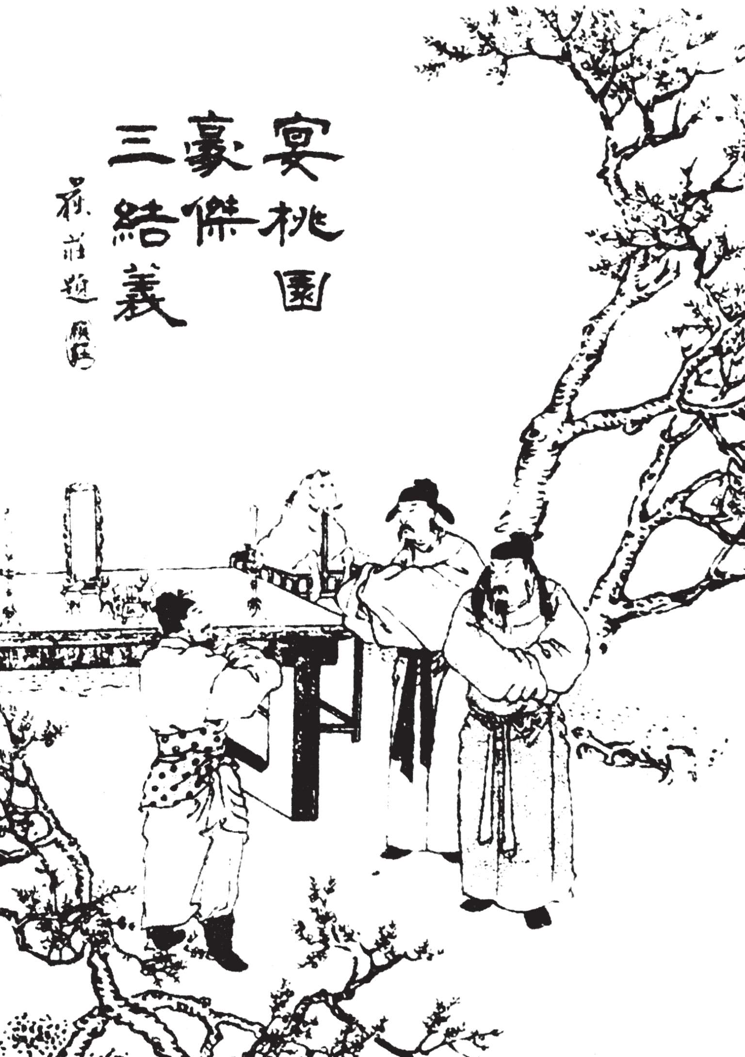 张飞说:“我家后面有个桃花园,现在花开得正盛。我们应该去园中祭拜天地,结为异姓兄弟,协力同心,去创一番事业。”刘备和关羽齐声答应。第二天,三人在桃园里焚香祭拜,发誓不求同年同月同日生,只愿同年同月同日死,从此结为同甘共苦的兄弟。刘备为兄,关羽次之,张飞为弟。结拜过后,三人开始仔细谋划,在当地征集勇士五百余人,良马数十匹。关羽请人打造青龙偃月刀,又名“冷艳锯”,重八十二斤。张飞打造一支丈八点钢矛。人马齐备后,他们前去见太守刘焉。玄德说起宗派,刘焉很高兴,将刘备认为侄子。