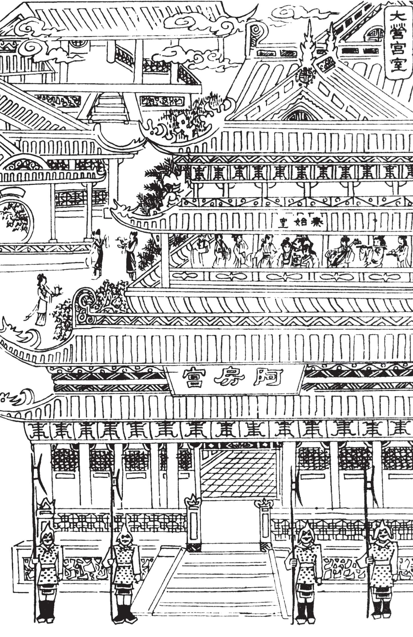 三十五年(前212年),始皇下令开通道路,从九原通到云阳,凿开大山,填平深谷,开通一条笔直的大道。这个时候始皇认为咸阳人口众多,先王的宫廷太小:“我听说周文王建都于丰,武王建都于镐,丰、镐一带,正是帝王建都的地方。”于是在渭水以南的上林苑中兴建宫殿。先兴建的是前殿阿房宫,东西长五百步,南北宽五十丈,殿上可以坐一万人,殿下可以竖起五丈高的旗杆。四周环绕可以驾车驰骋的阁道,从殿下一直通到南山。在南山顶修建观楼为标记。在空中架设复道,从阿房宫可以渡过渭水,与咸阳相连,以此象征天极阁道越过银河直通营室。阿房宫还没有完工,完工后,想要另取一个好听的名字。这座宫殿是在阿房建造的,所以天下人称其为阿房宫。隐官服役的罪犯七十多万人,分批去修建阿房宫,或者修建丽山陵墓。从北山采下石头,从蜀地、楚地运来木材,都送到阿房宫。关中的宫殿一共有三百座,关外有四百多座。于是在东海边的朐县境内立下石碑,以此为秦地东方的门户。因而迁徙三万户百姓到丽邑居住,五万户到云阳居住,都免除十年的徭役。