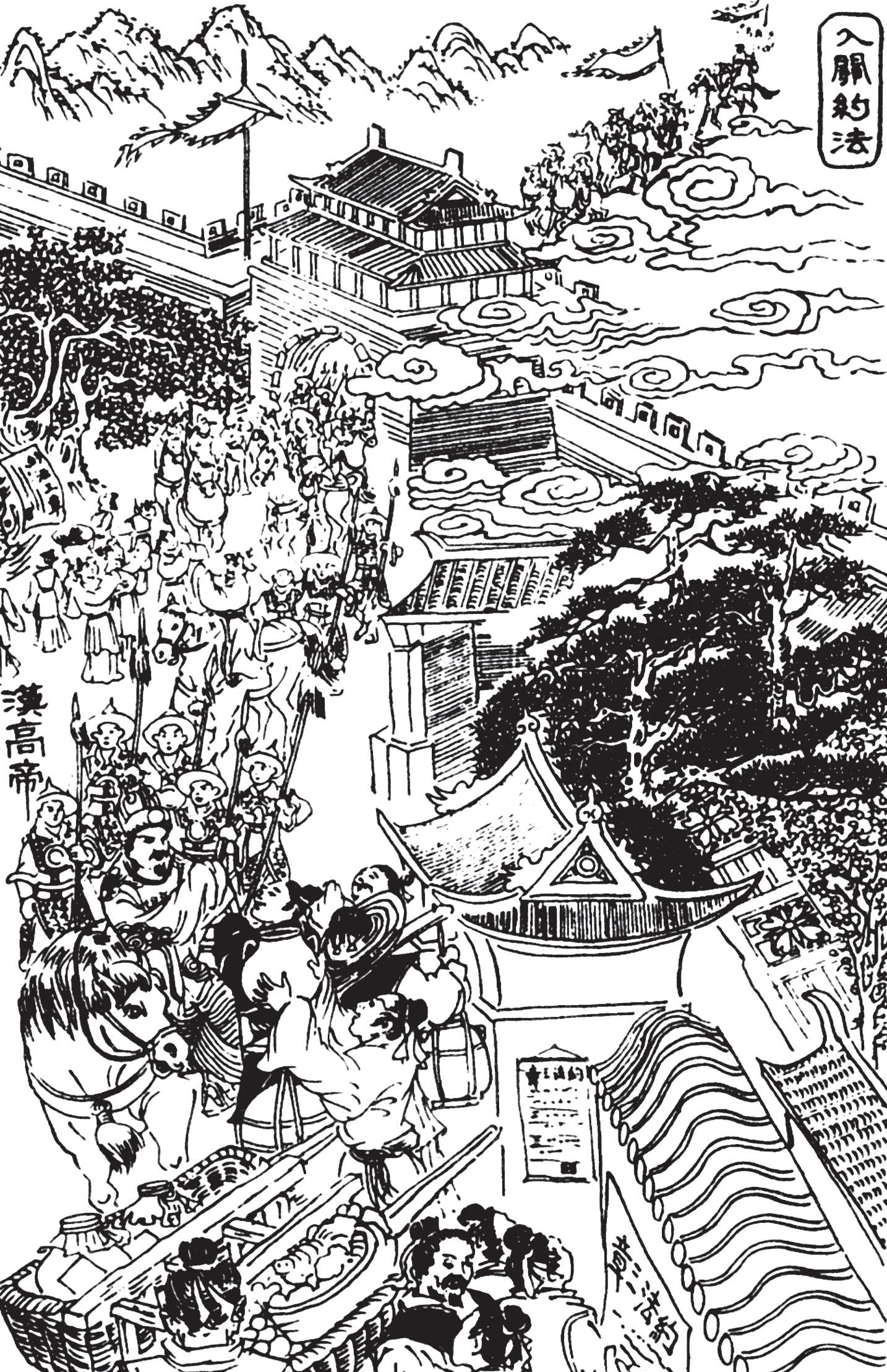 汉元年(前206年)十月,沛公的军队最终先于各路诸侯到达霸上。秦王子婴乘坐素车白马,用丝绳系着脖子,封好皇帝印玺和符节,在轵道旁投降。众将领中有的人建议诛杀秦王。沛公说:“最初怀王派我来,本来就是因为我能宽容。况且人家已经投降了,还要杀掉人家,这样做不吉利。”他就将秦王交给官吏,向西进入咸阳。沛公想要留在宫中歇息,樊哙、张良劝谏,他才封存秦宫的珍宝财物及府库,撤回霸上驻扎。沛公召集各县的父老及豪杰说:“各位父老深受秦朝的严苛法令折磨已经很久了,批评朝政的要灭族,相聚交谈的要弃市。我和诸侯约定,先进入关中的人在这里称王,我应当在关中称王。我和父老约法三章:杀人的处死,伤人和劫掠的根据罪行来治罪。其余的秦朝法令全部废除。众官吏和百姓都像往常一样安居乐业。我来到这里的原因,就是要为父老铲除祸害,不会有欺凌施暴的行为,不要害怕!况且我撤回霸上驻扎,只是要等诸侯前来共同制定法令罢了。”于是他派人和秦地的官吏巡视县乡邑,告谕百姓。秦地百姓十分高兴,争相送来牛羊酒食犒劳将士。沛公又推辞不接受,说:“仓库的粮食充足,不缺少食物,不想让你们破费。”民众更加高兴,只怕沛公不做秦王。