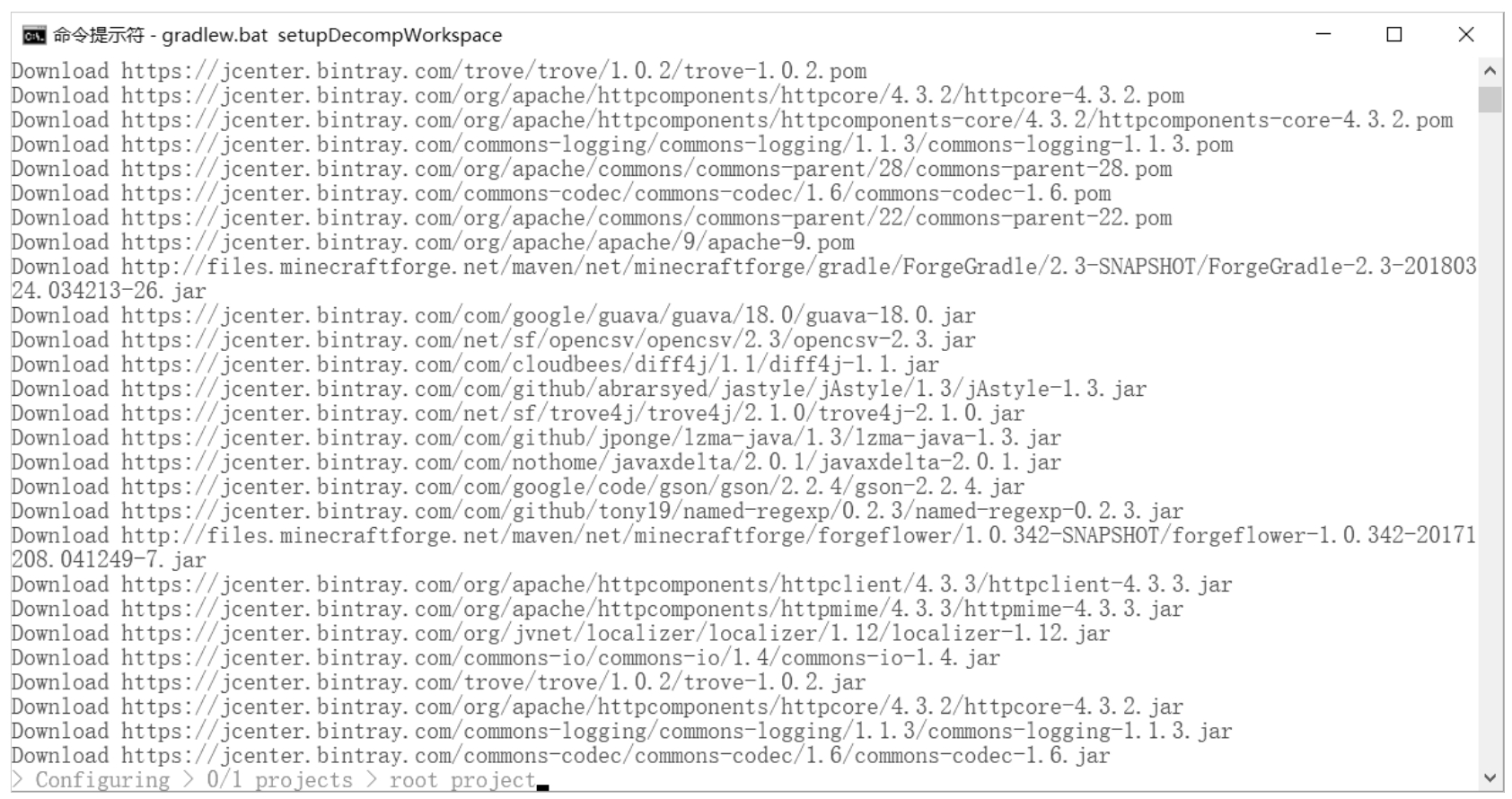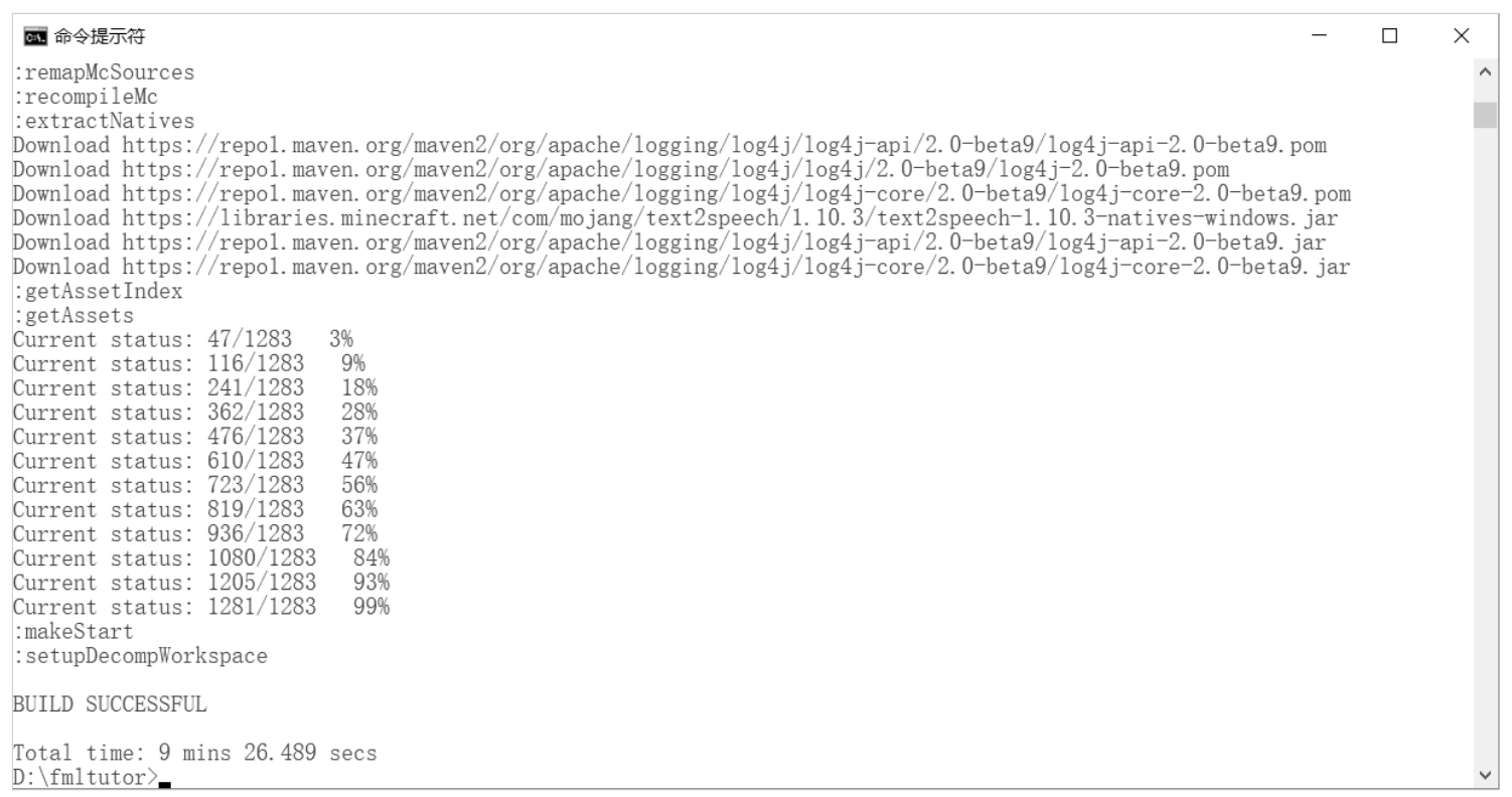 这说明目前Forge正在下载相关的文件,这也是配置开发环境时要求网络畅通的原因。直到BUILD SUCCESSFUL的字样出现,这代表配置开发环境的工作已经完成第一步了。