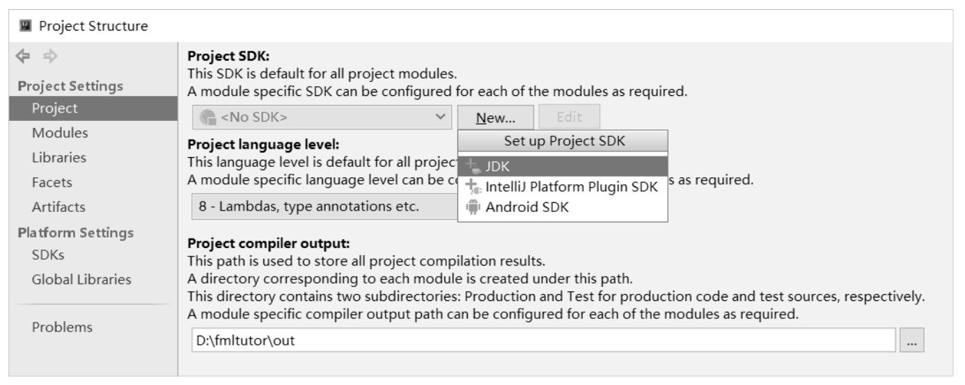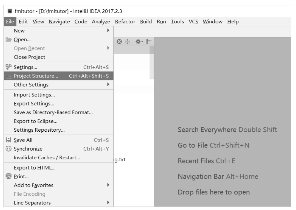 可能还需要指定JDK的位置。如果使用的是IntelliJ IDEA,那么请在菜单栏执行File→Project Structure命令。