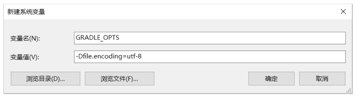 首先新建一个名为GRADLE_OPTS的变量其值为-Df ile.encoding=utf-8。